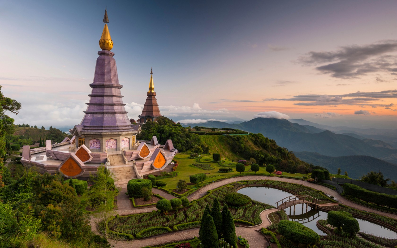 Description: A large building with a lot of windows on top of a hill with a pond in front of it.
