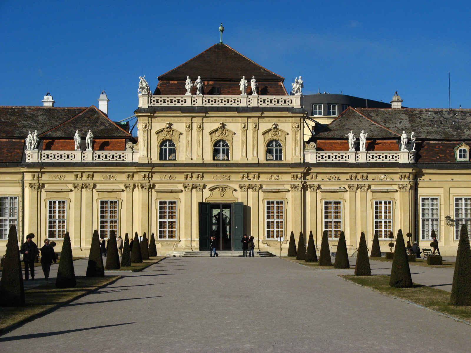 Description: A large building with a lot of windows and a walkway leading to it with a clock on the top of it.