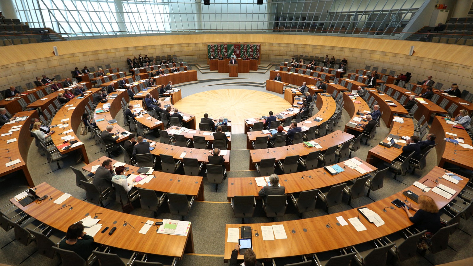 Description: A large circular room with a lot of tables and chairs in it and people sitting at the tables in the middle.