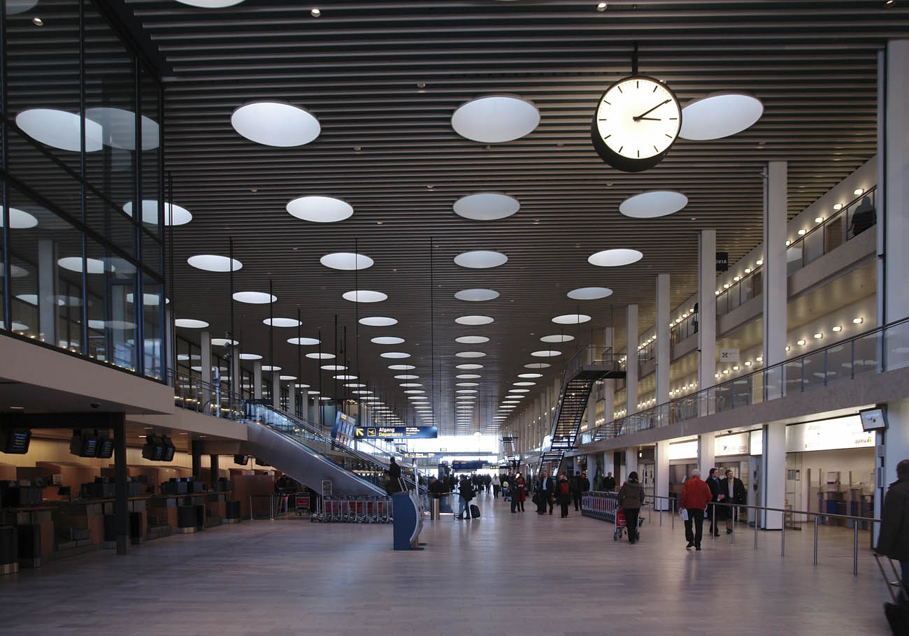 Description: A large clock hanging from the ceiling of a building with people walking around it and a staircase leading up to it.