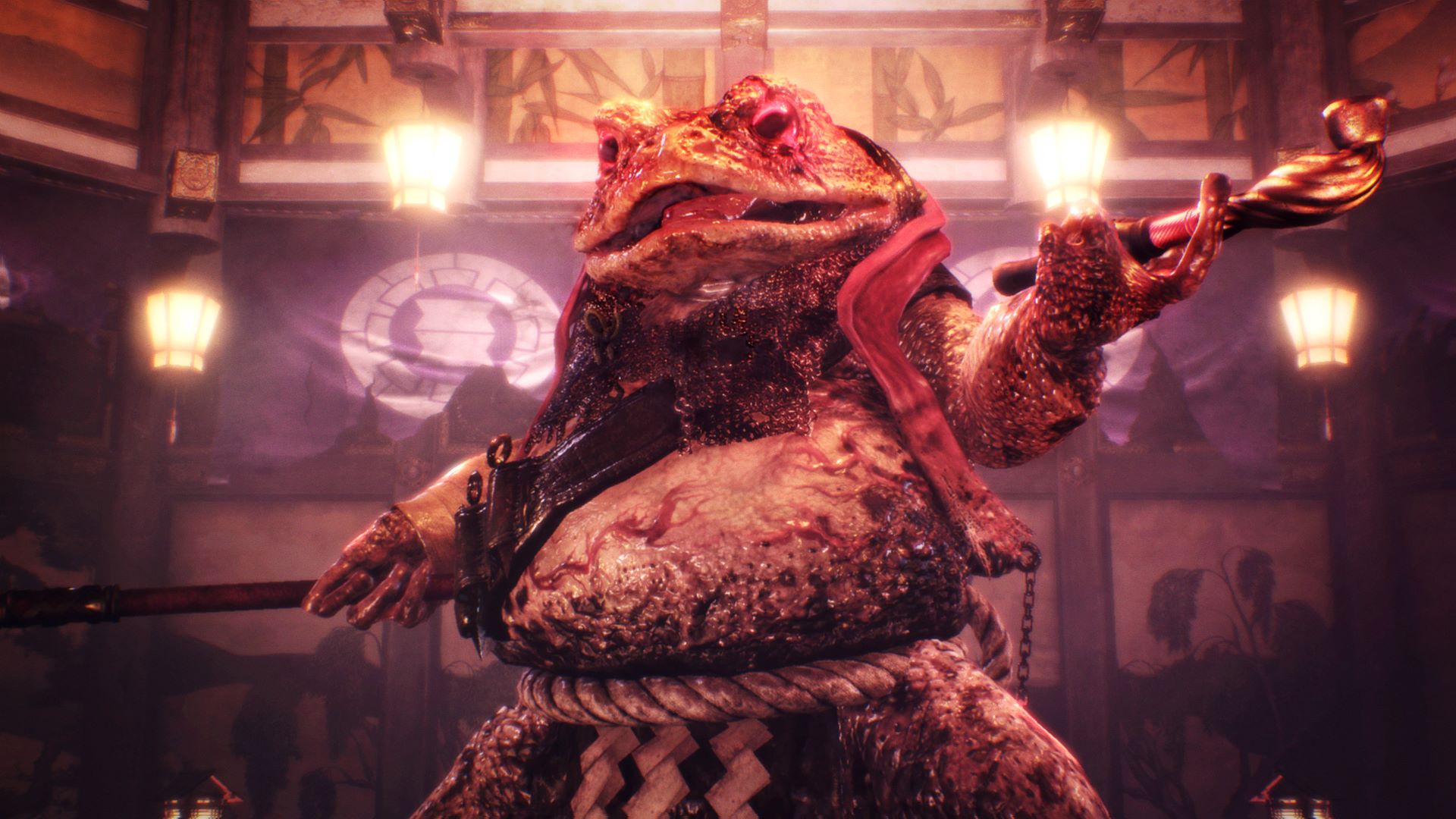 Description: A large creature with a knife in a room with clocks and lights on the walls and a clock tower in the background.