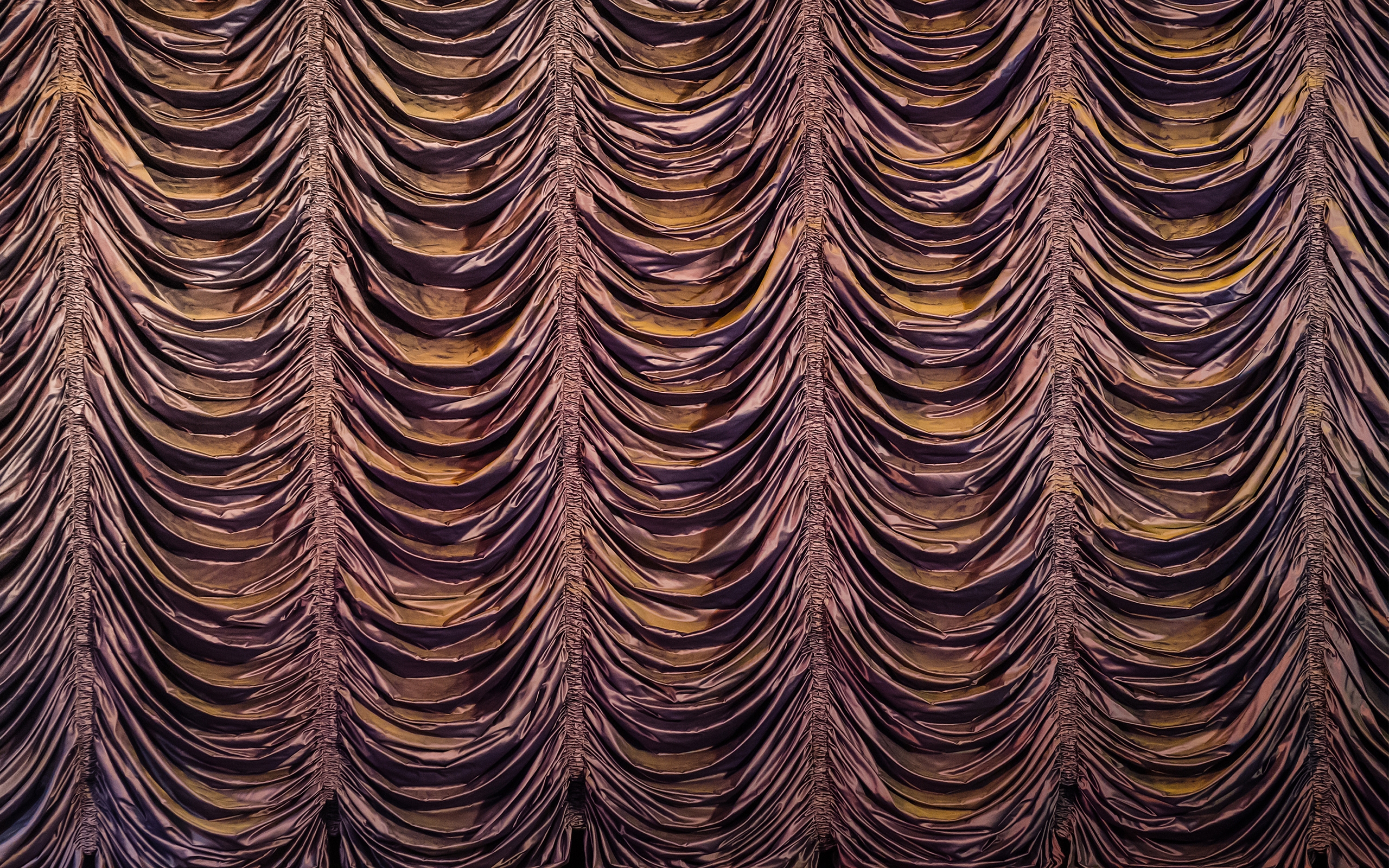 Description: A large curtain with a pattern of wavy lines on it's side and a yellow light in the middle.
