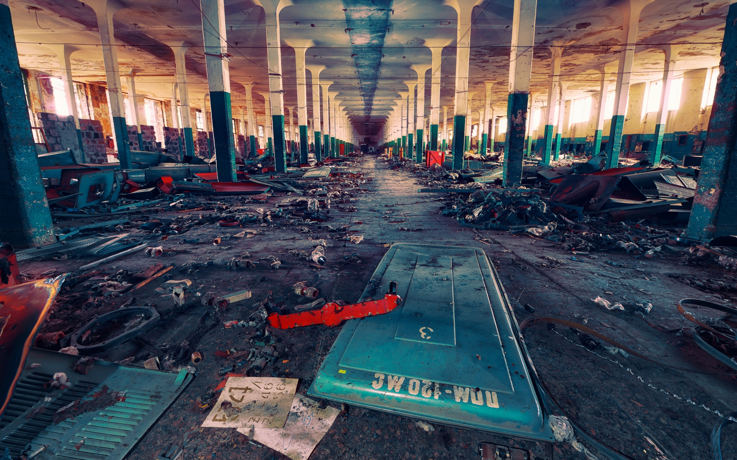 Description: A large room with lots of debris and a tennis court in it.