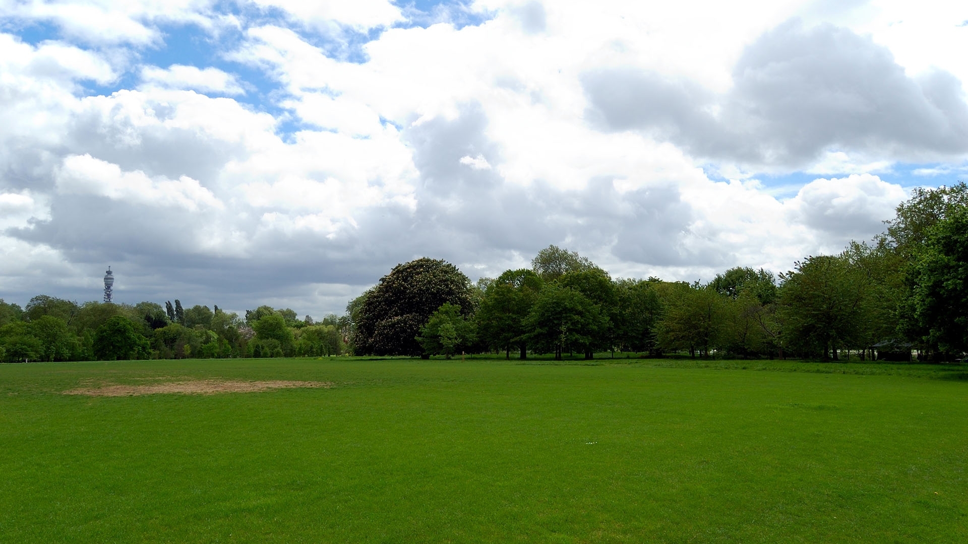 Description: A large field with a few trees in the background and a sky with clouds above it and a few trees in the foreground.