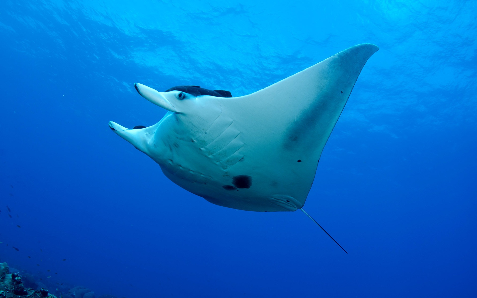 Description: A large fish swimming in the ocean near a coral reef with a diver nearby on a sunny day with blue water.