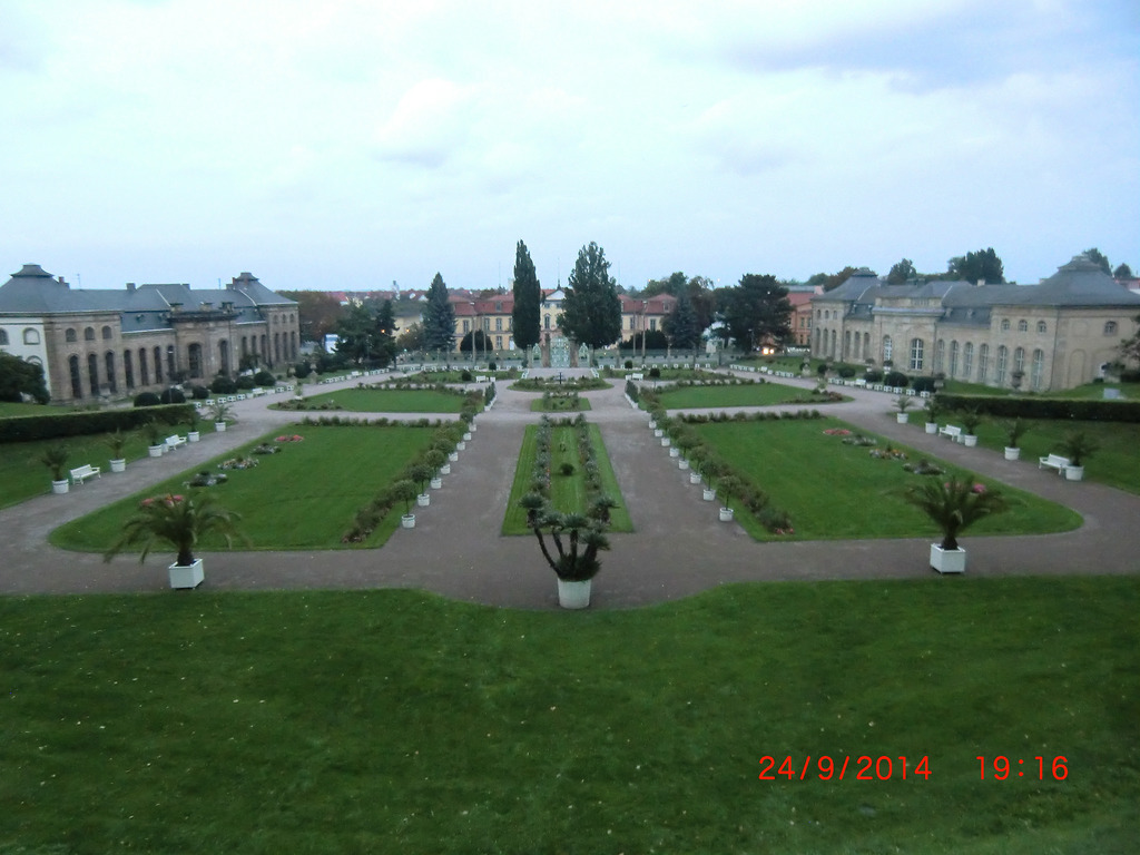Description: A large garden with a lot of plants in it and a building in the background with a clock tower.