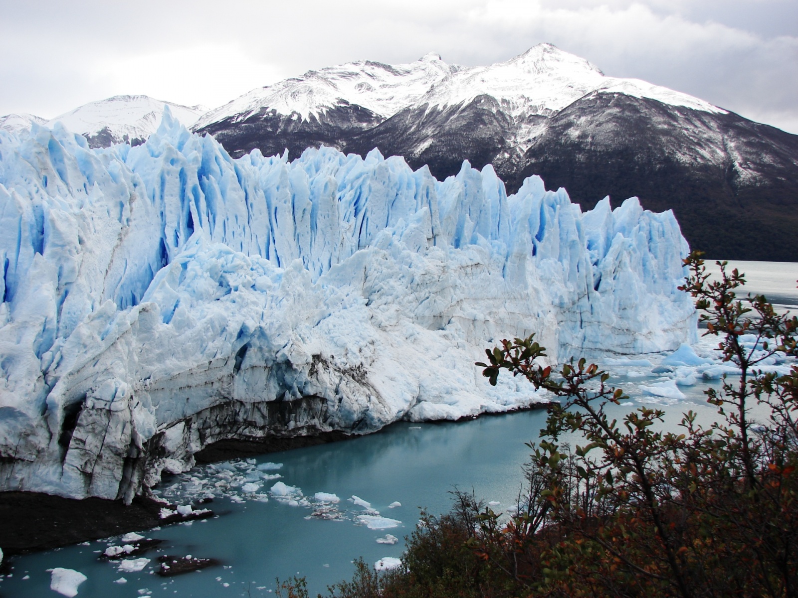 Description: A large glacier with a lake below it and mountains in the background with snow on the tops of the mountains.