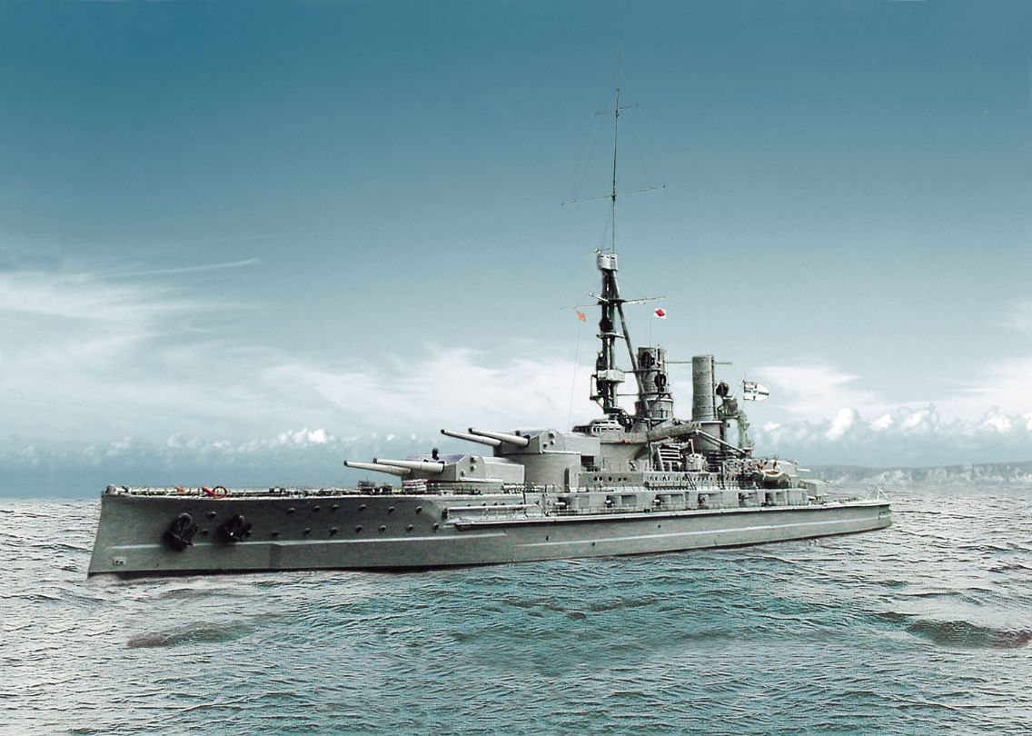 Description: A large gray boat in the middle of the ocean with a sky background and clouds in the background.
