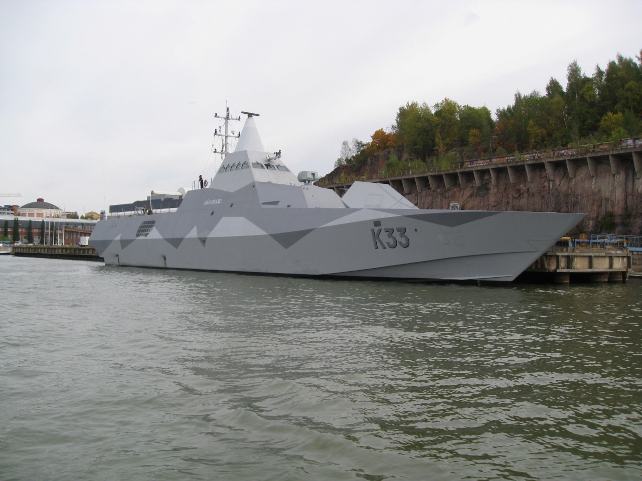 Description: A large gray boat in the water near a dock and a wall of trees and a bridge in the background.