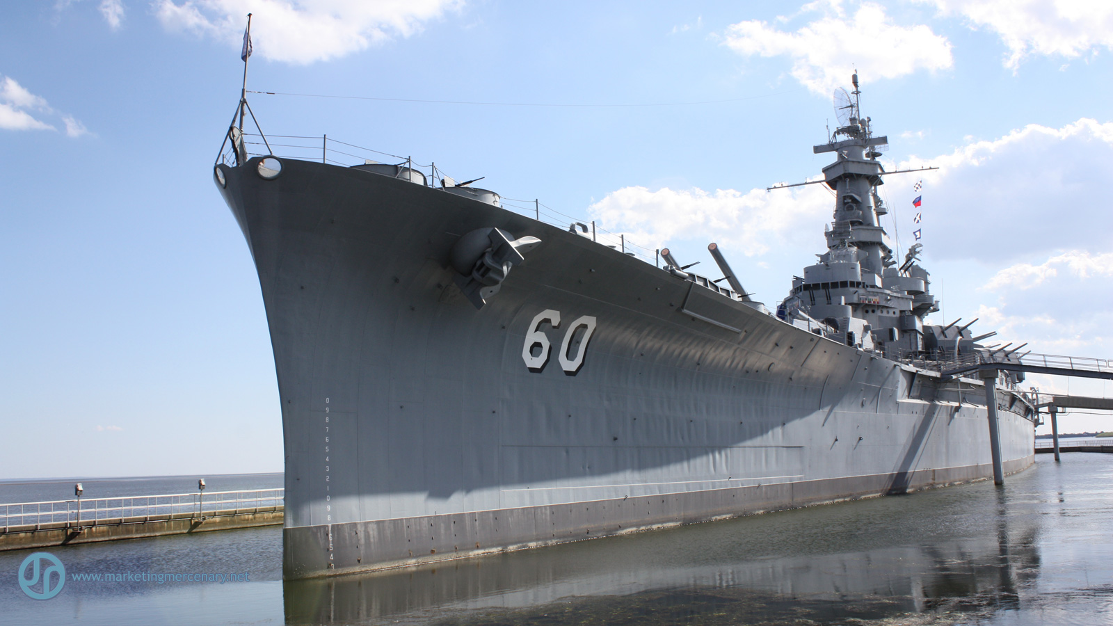 Description: A large gray ship docked at a pier with a sky background and clouds in the background and a few people standing on the dock.