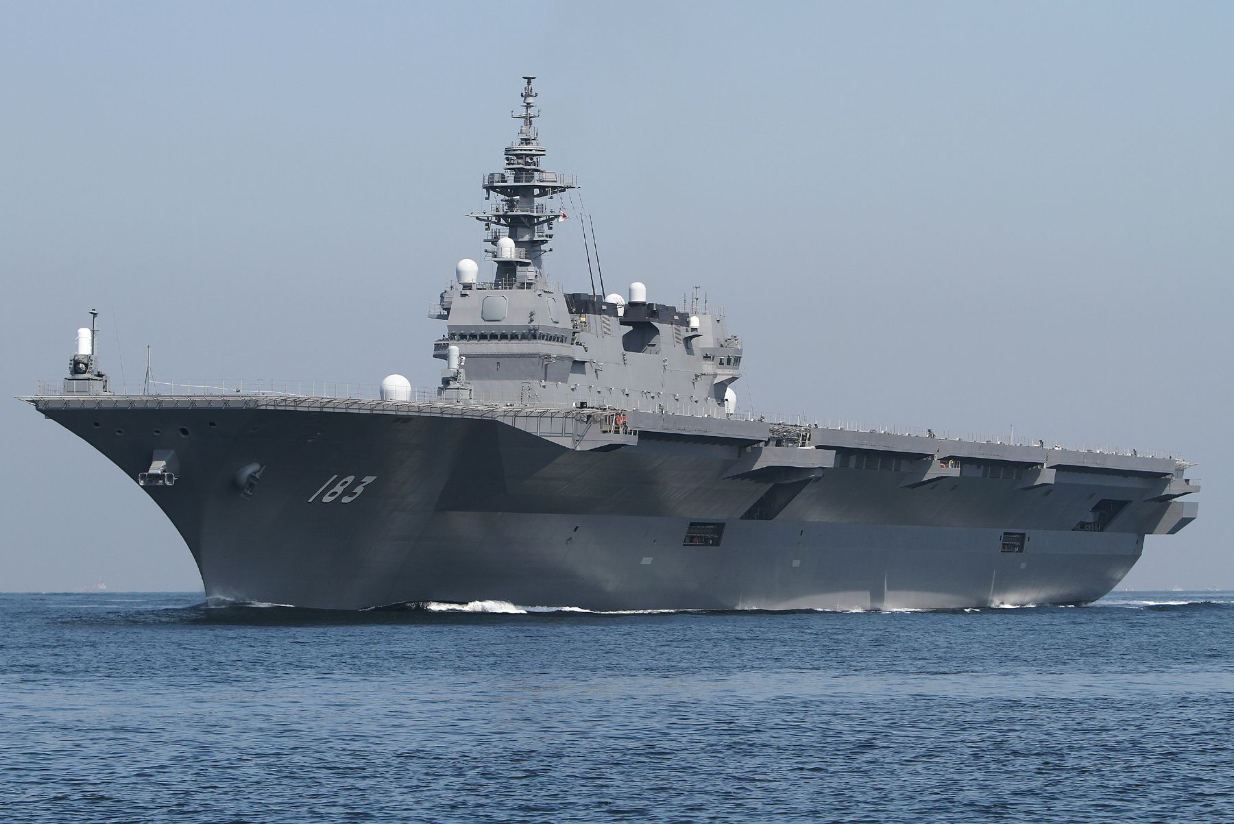 Description: A large gray ship in the middle of the ocean with a sky background and a few clouds in the sky.