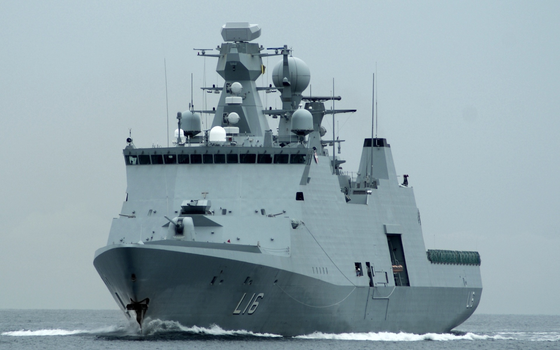 Description: A large gray ship in the water with a person standing on the side of it's hull in the water.