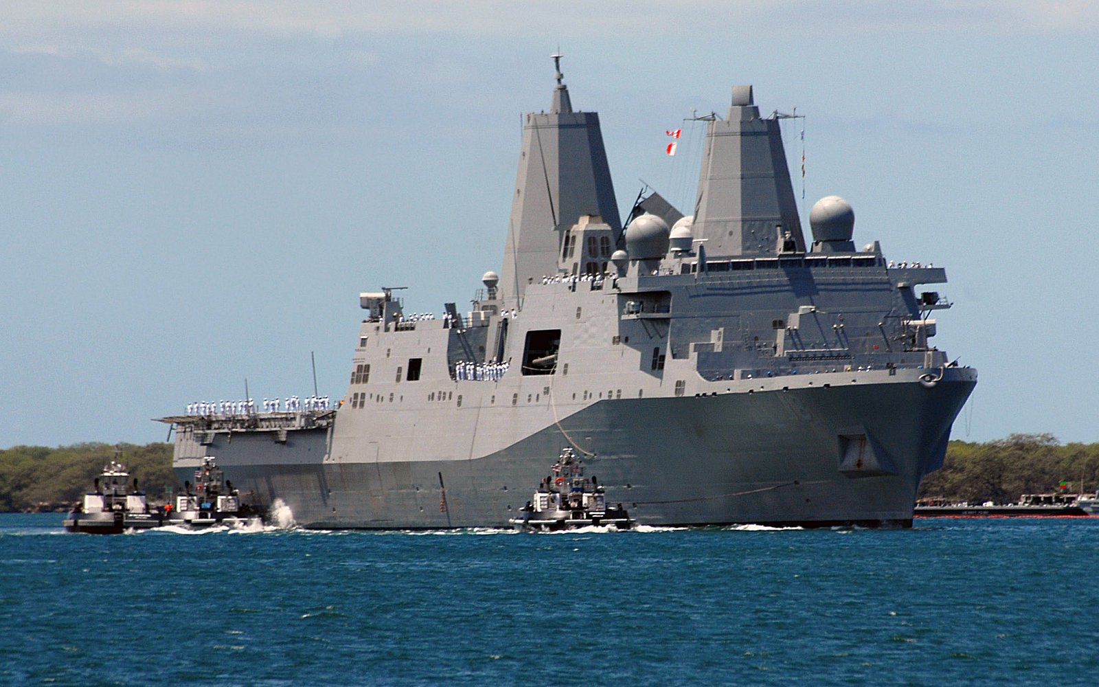 Description: A large gray ship in the water with tug boats in front of it and a smaller boat in the water.