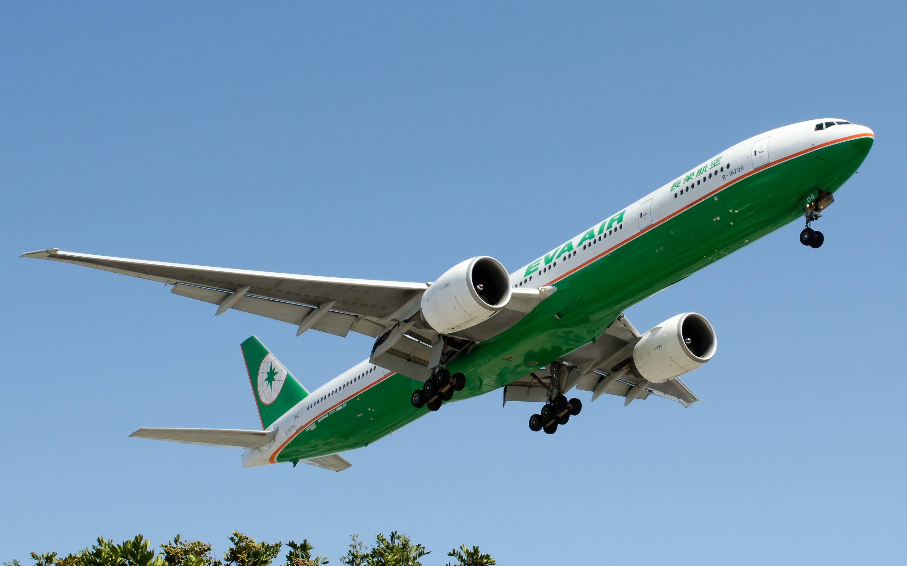 Description: A large green and white airplane flying in the sky above trees and bushes on a clear day with a blue sky.