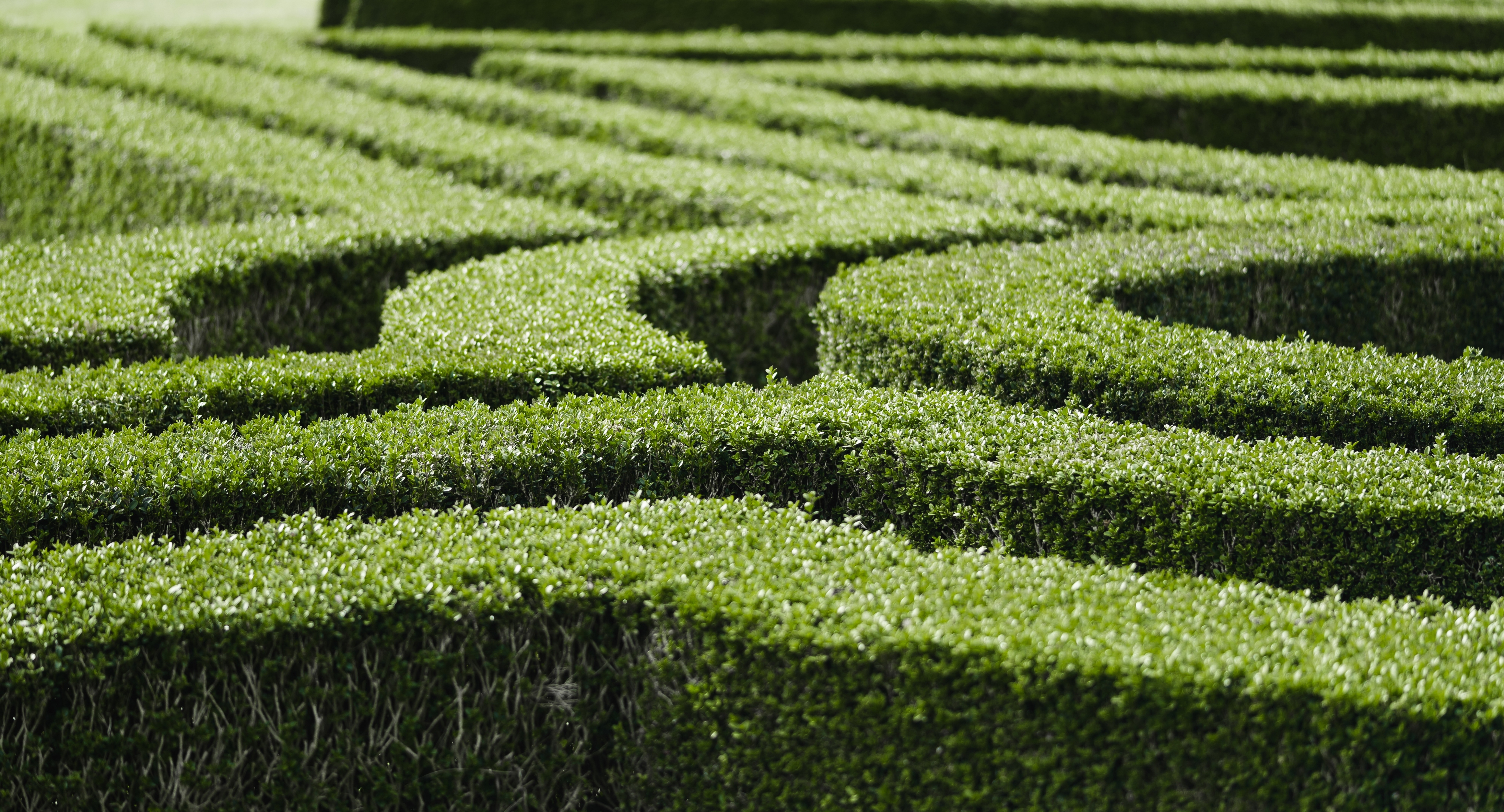 Description: A large green hedge maze with a bird in the middle of it's maze hole.