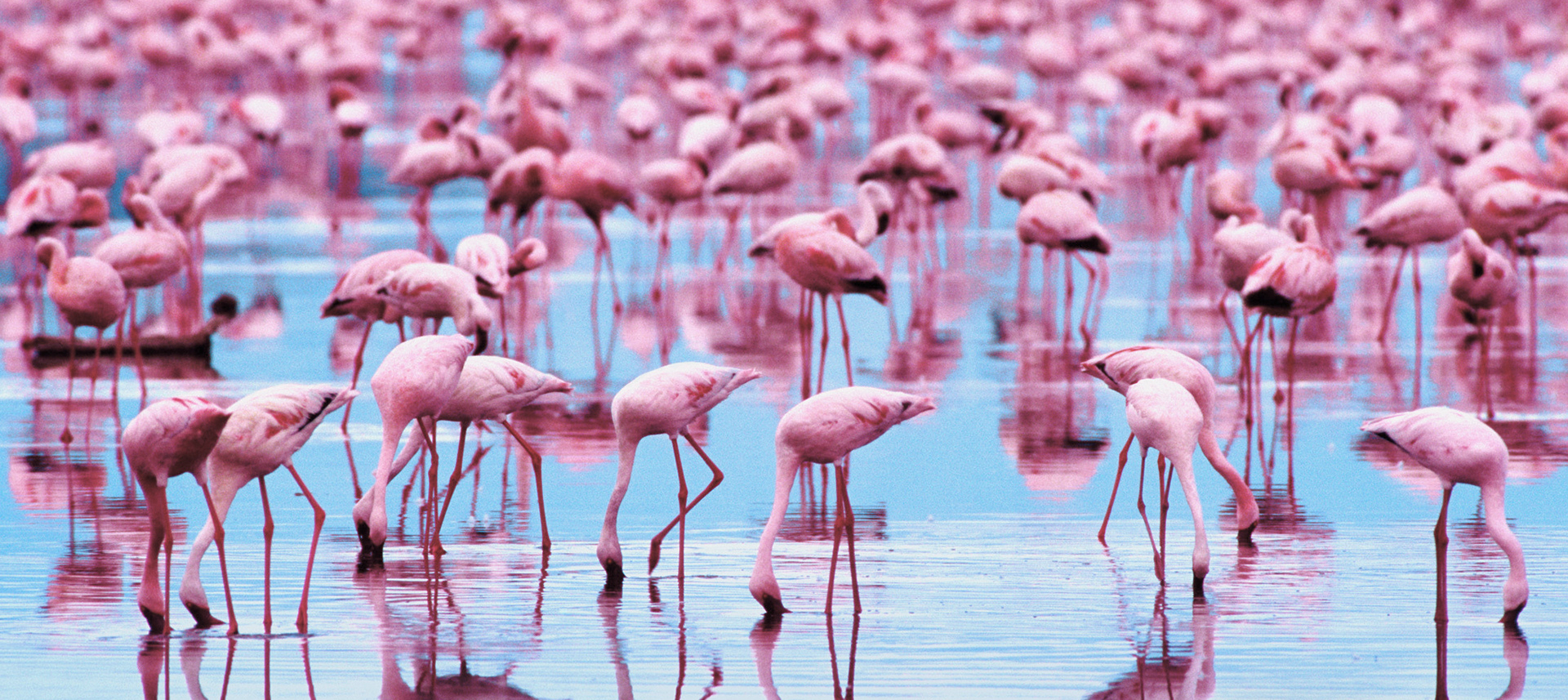 Description: A large group of flamingos standing in the water together in a field of pink flamingos.