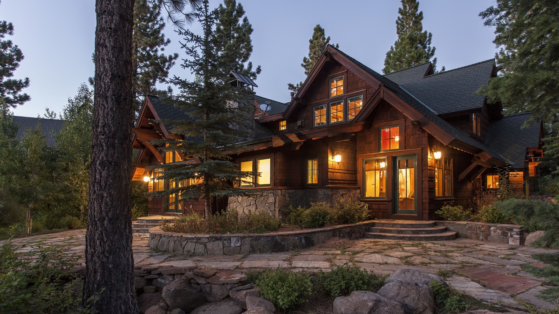 Description: A large house with a lot of windows and a stone walkway leading to it and a tree in front of it.