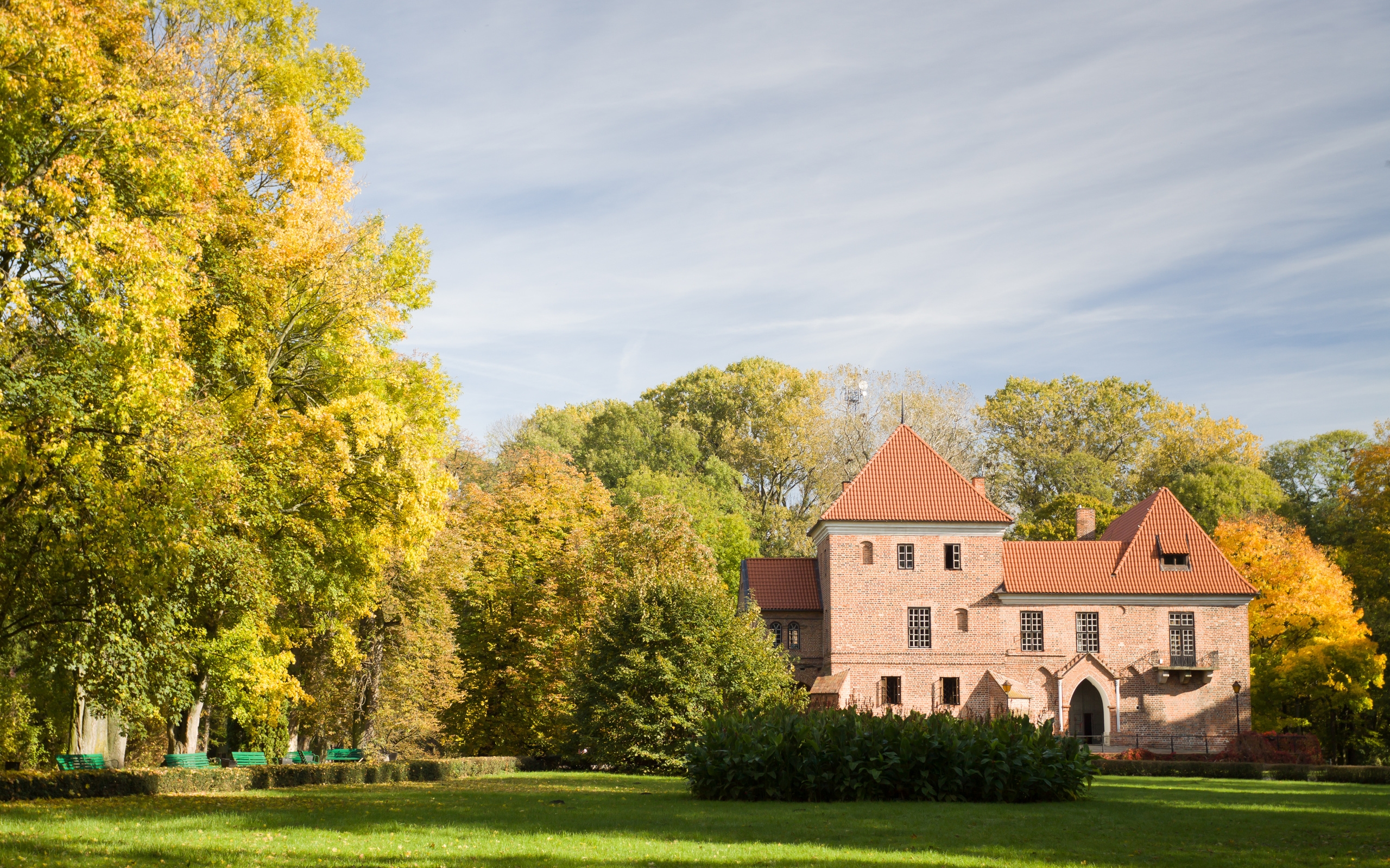 Description: A large house with a tower and a lawn in front of it and trees in the background with yellow leaves.