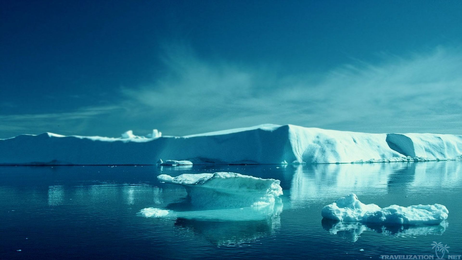 Description: A large iceberg floating in the ocean next to a large iceberg in the distance with a few icebergs floating in the water.