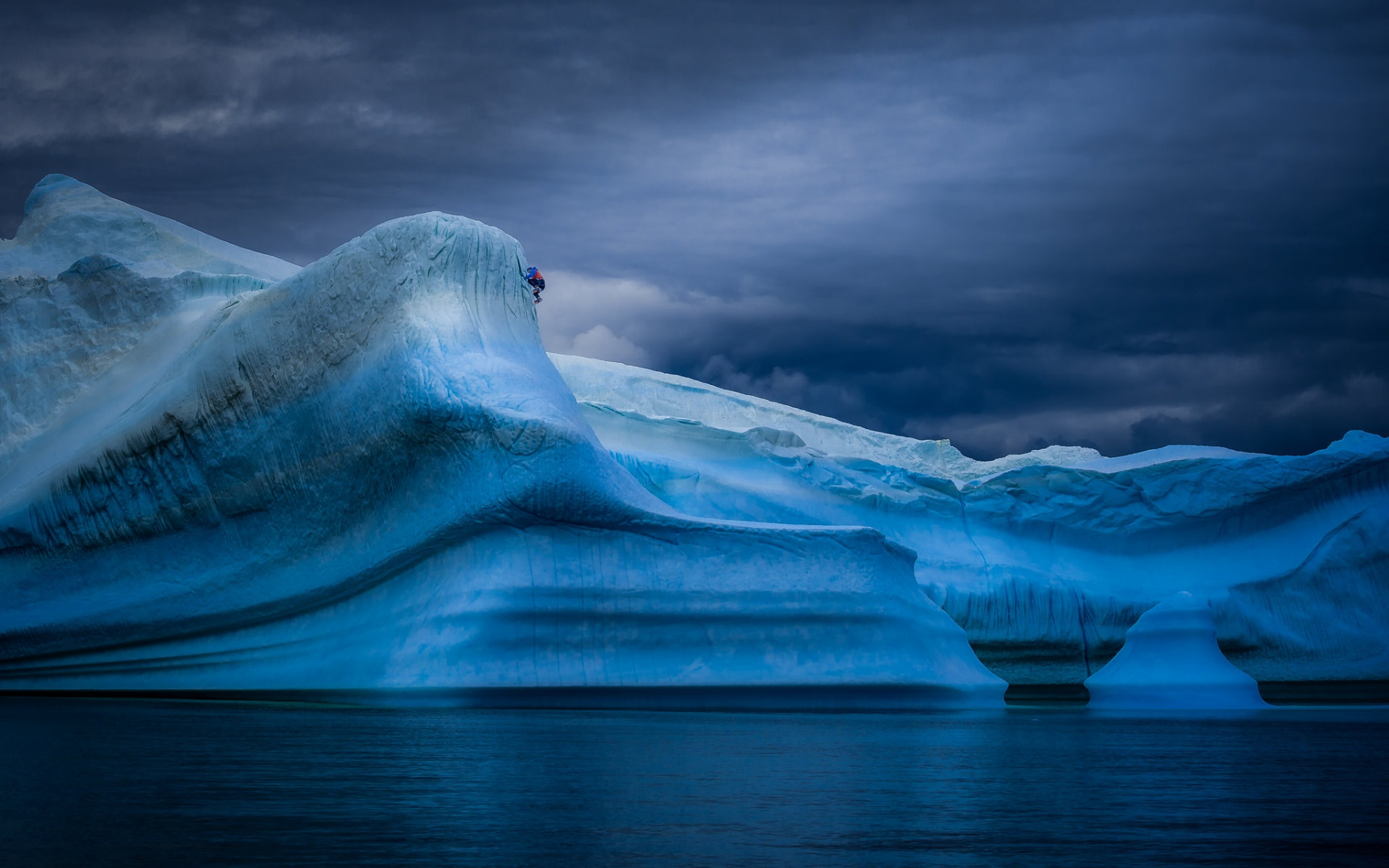 Description: A large iceberg floating in the ocean under a cloudy sky with a person standing on top of it.
