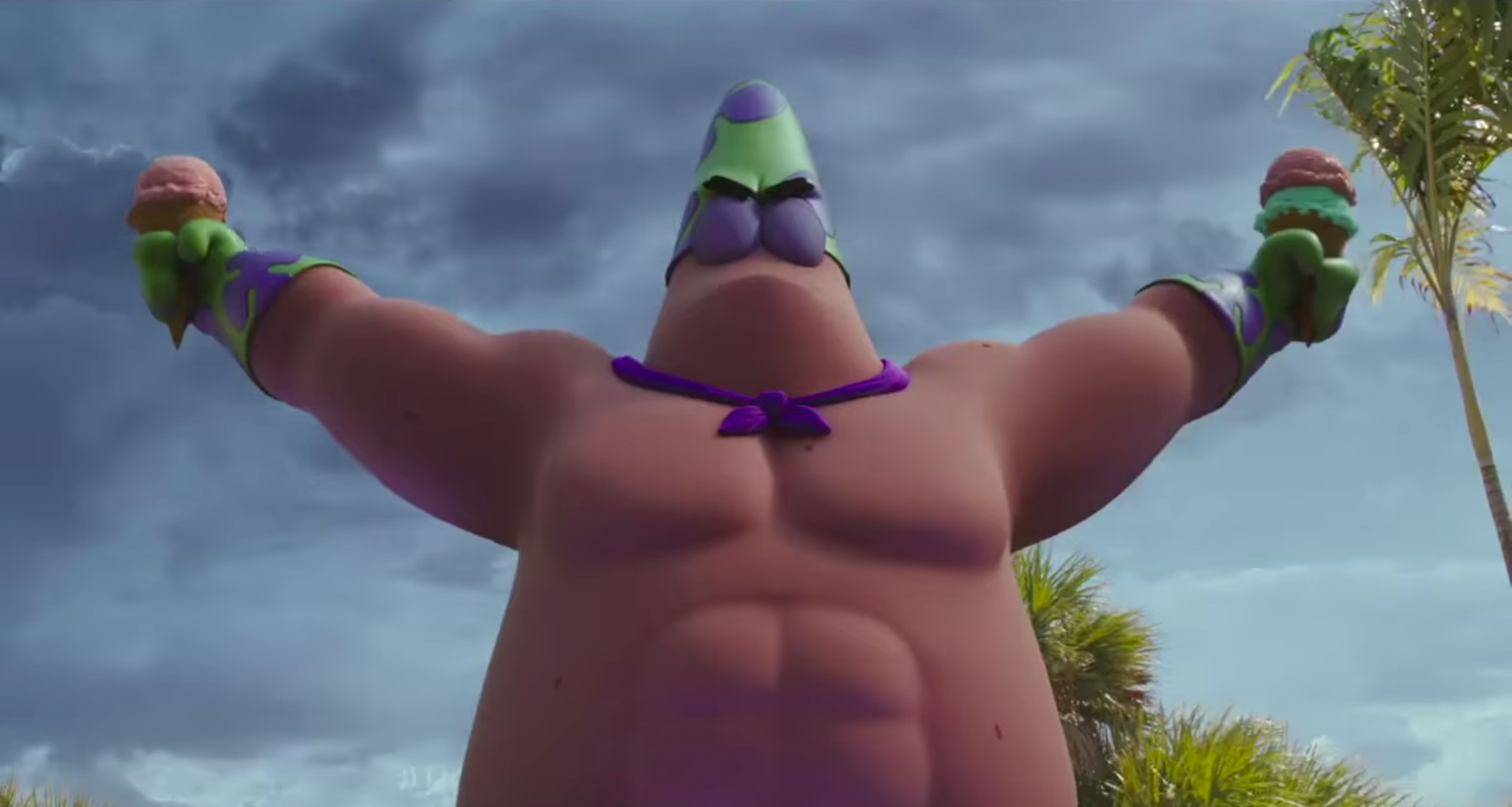 Description: A large inflatable character with a hat and sunglasses on his head and arms in the air.