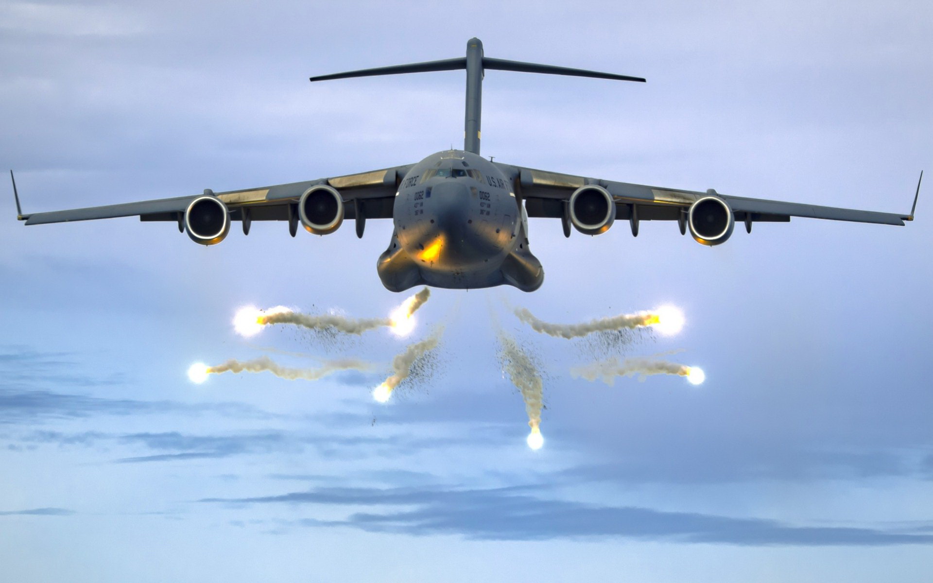 Description: A large jet flying through a cloudy blue sky with yellow smoke coming out of it's wings and a jet engine.