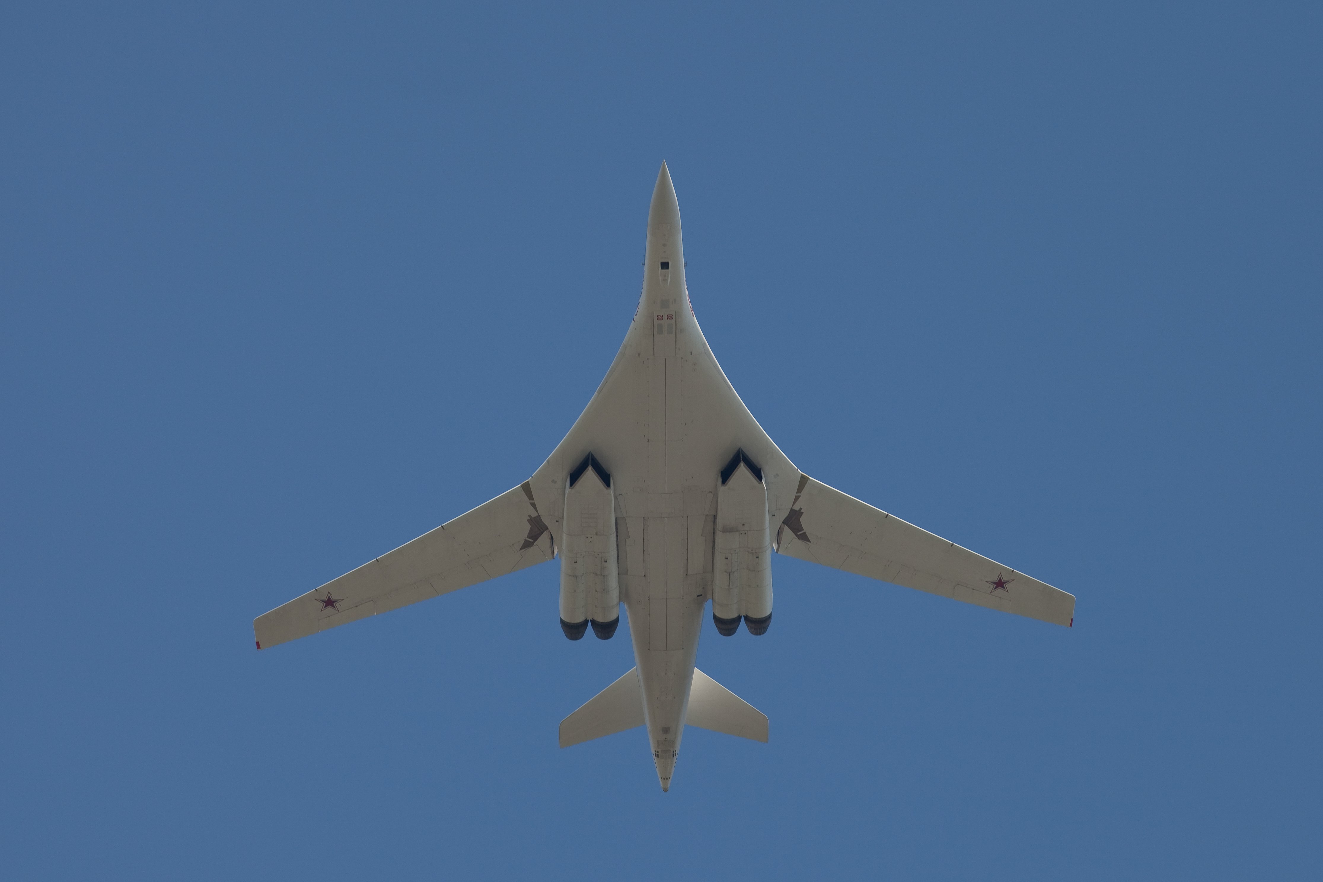 Description: A large jetliner flying through a blue sky with its landing gear down and its wings down and the bottom of the plane.