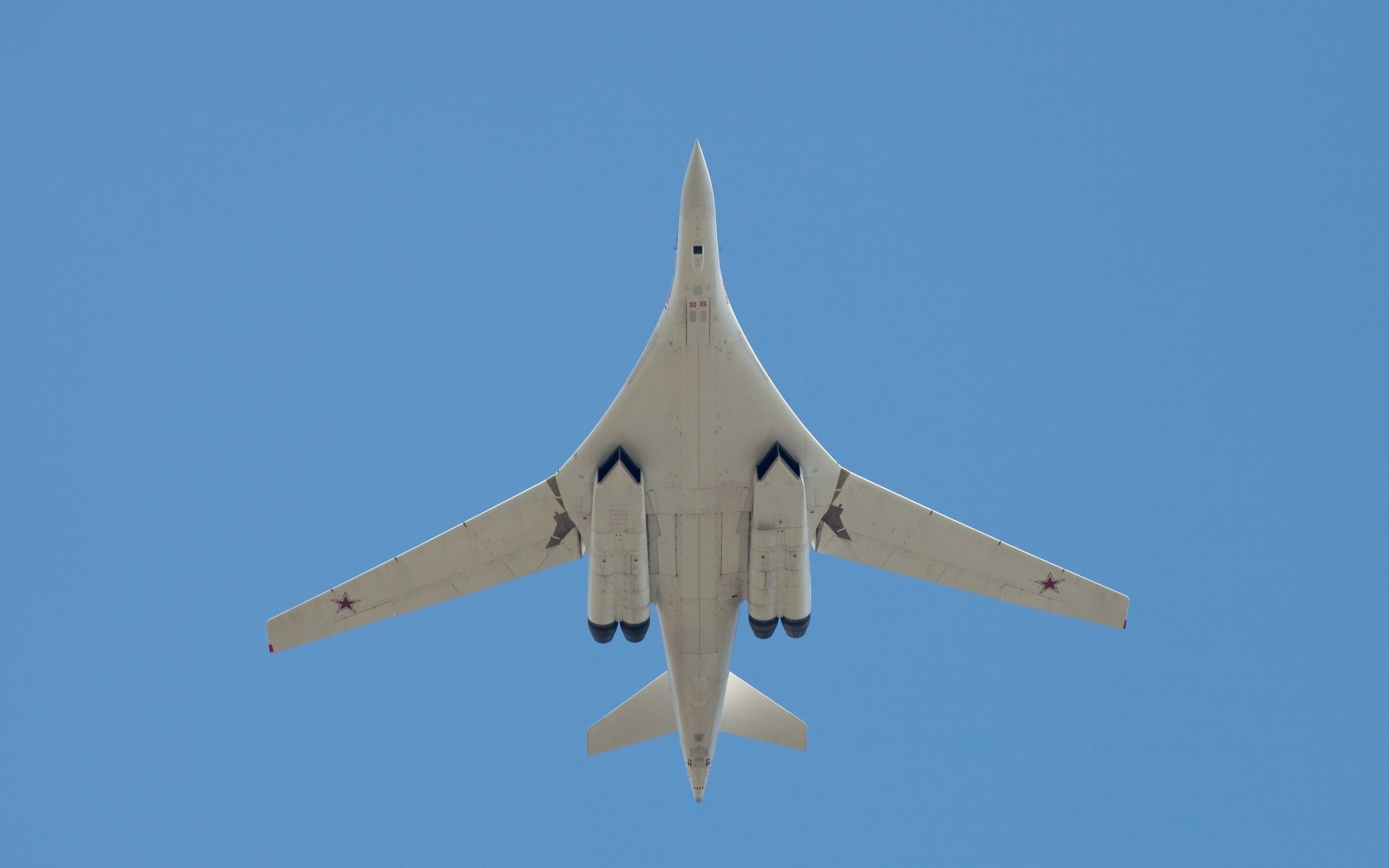 Description: A large jetliner flying through a blue sky with its landing gear down and its landing gear down and the bottom of the plane.