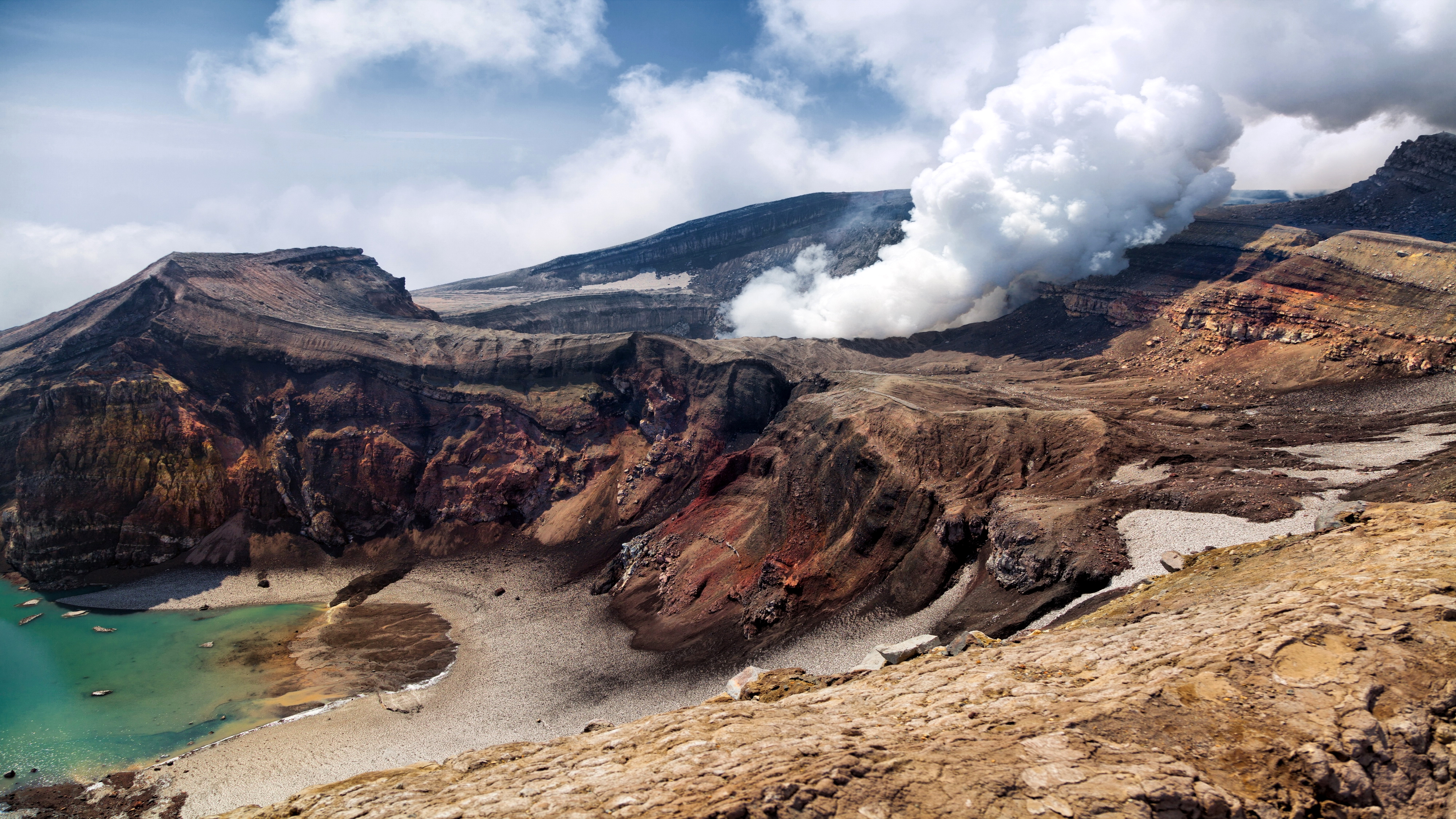 Description: A large mountain with a body of water below it and steam pouring out of the top of it.