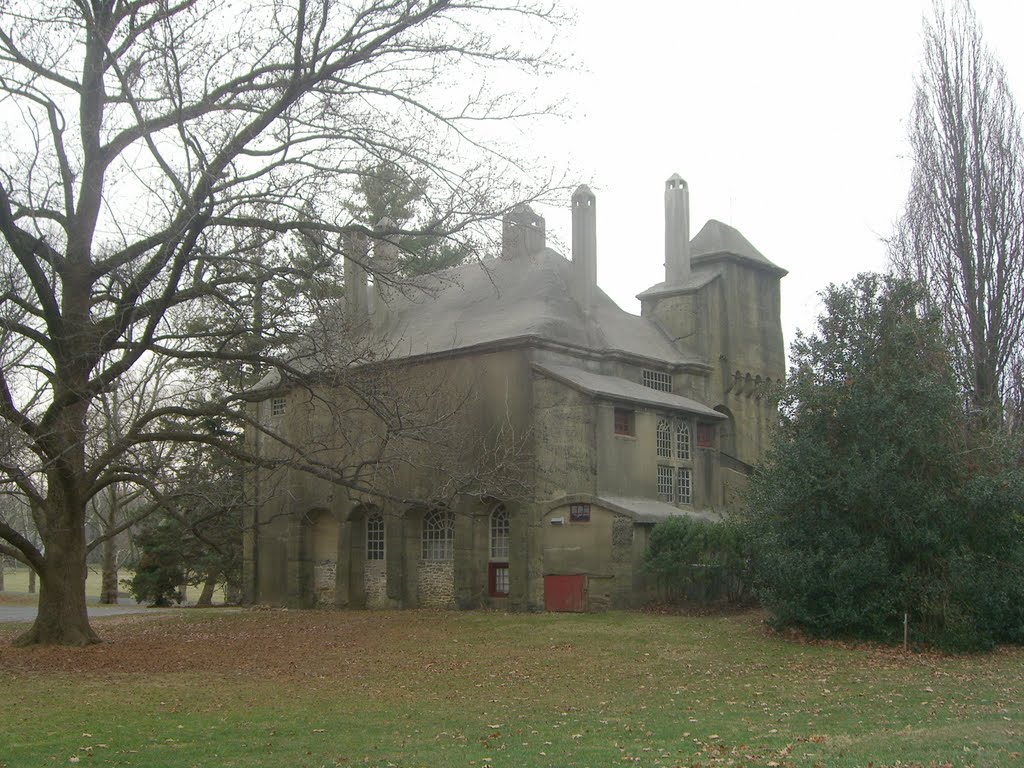 Description: A large old house with a red door and a tower on the front of it and a tree in front of it.