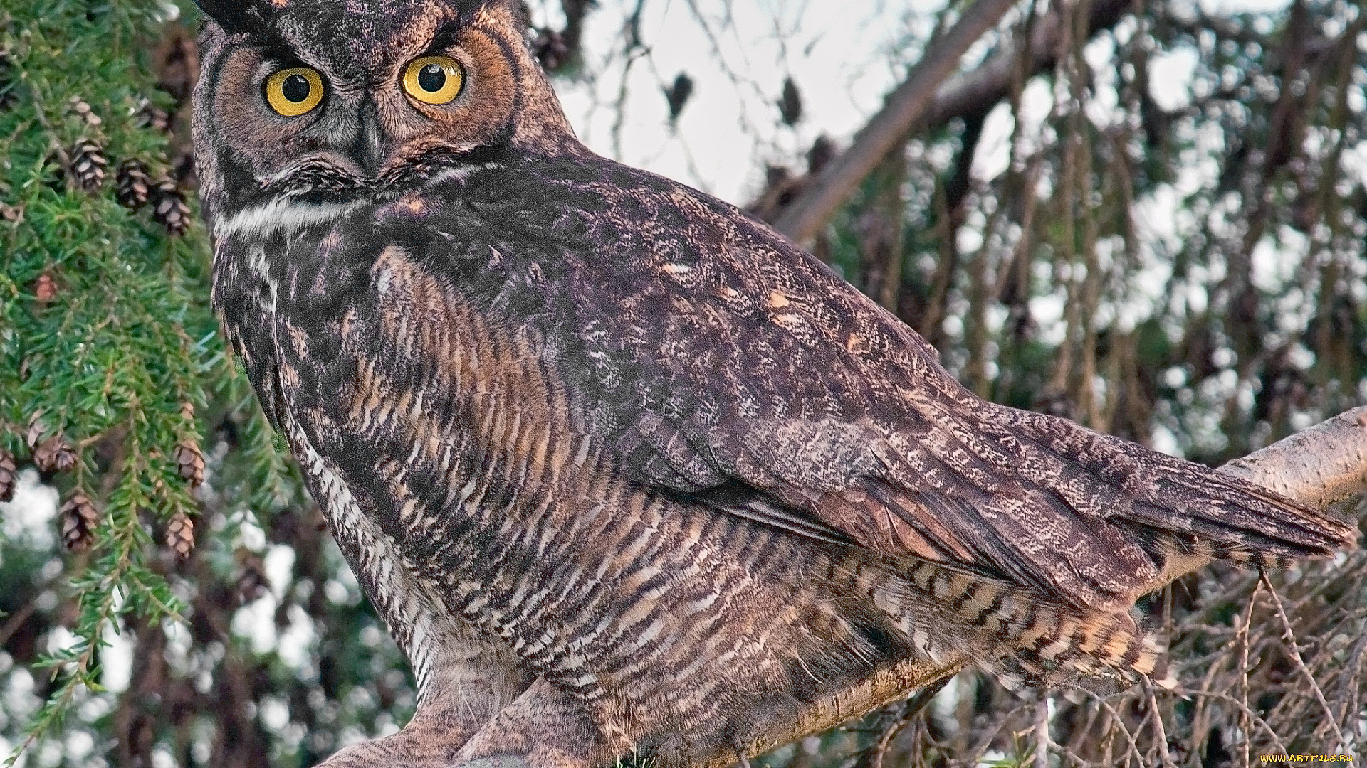 Description: A large owl sitting on top of a tree branch with yellow eyes and a black head and yellow eyes.