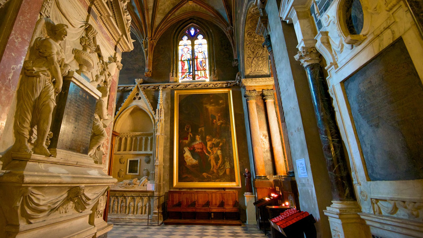 Description: A large painting in a very old building with a lot of windows and a bench in front of it.