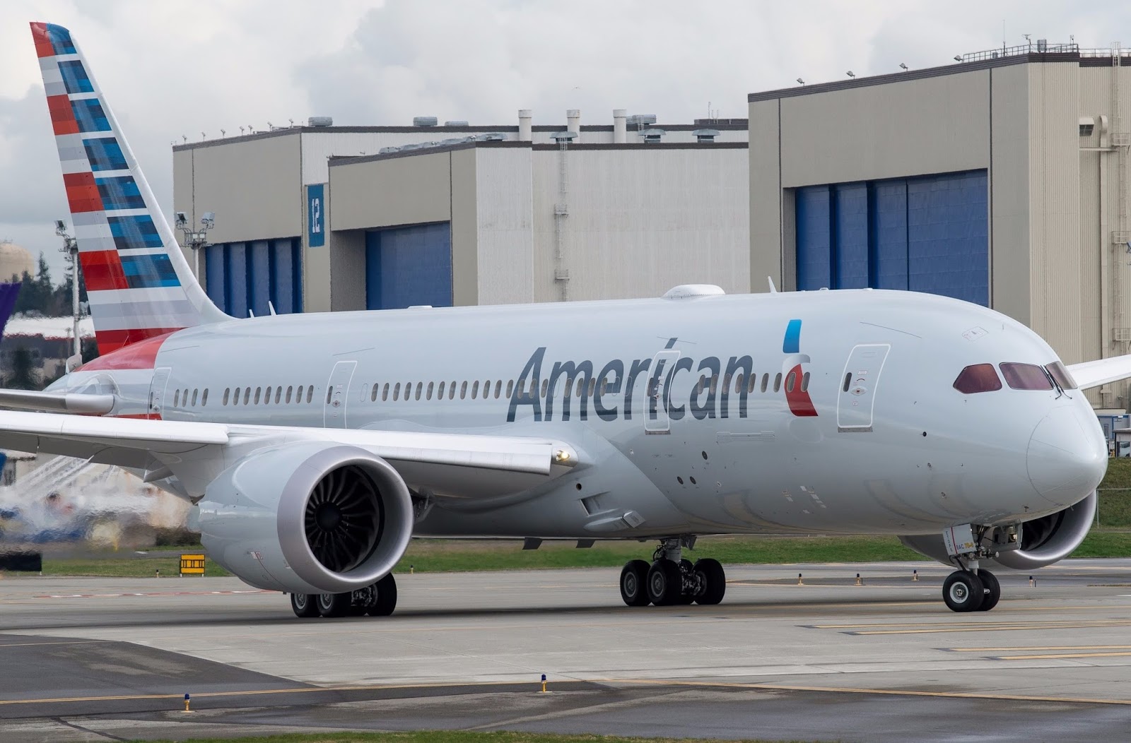 Description: A large passenger jet sitting on top of an airport runway next to a building with a ladder on it.