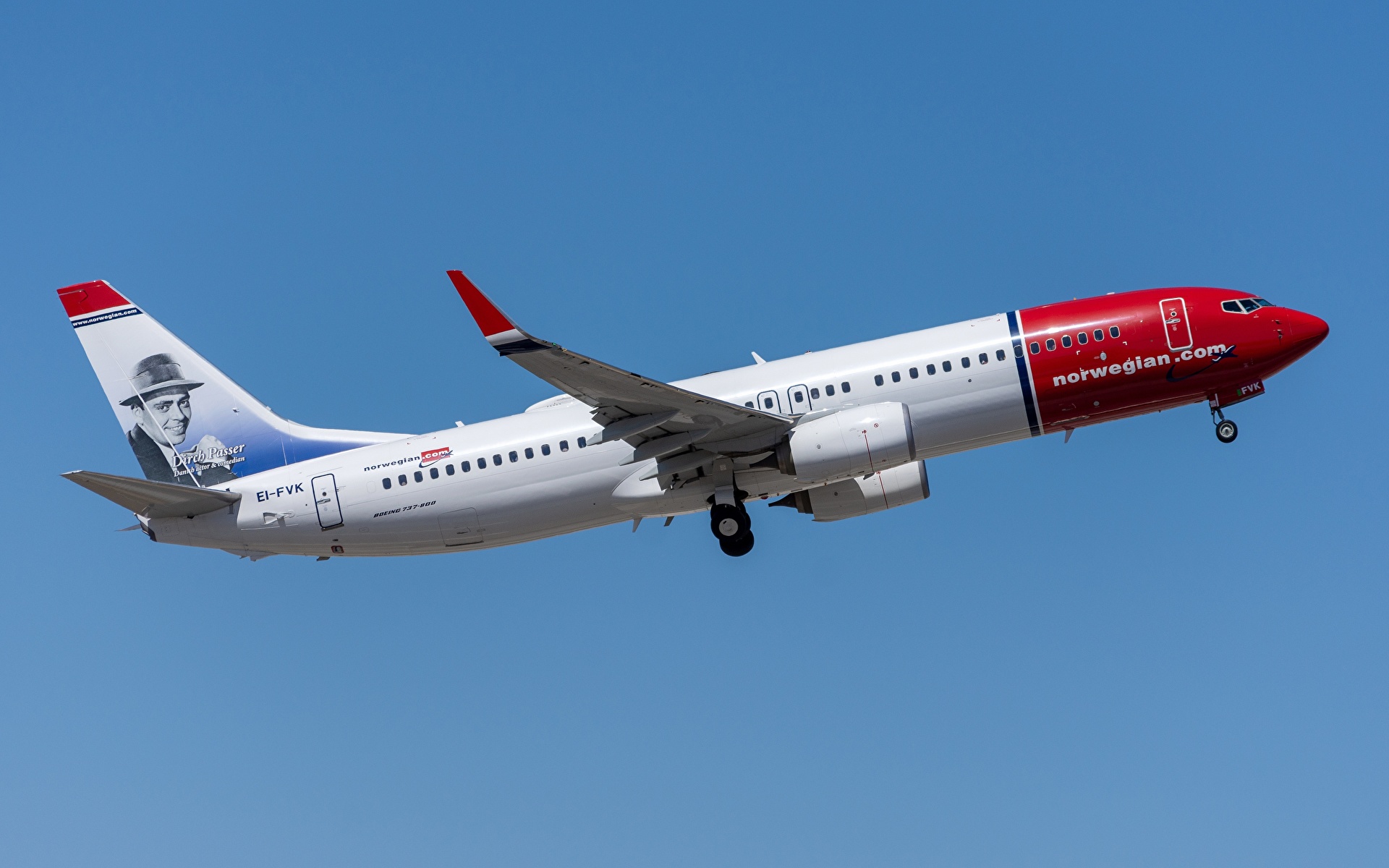 Description: A large passenger jet flying through a blue sky with a picture of a man on the side of the plane.
