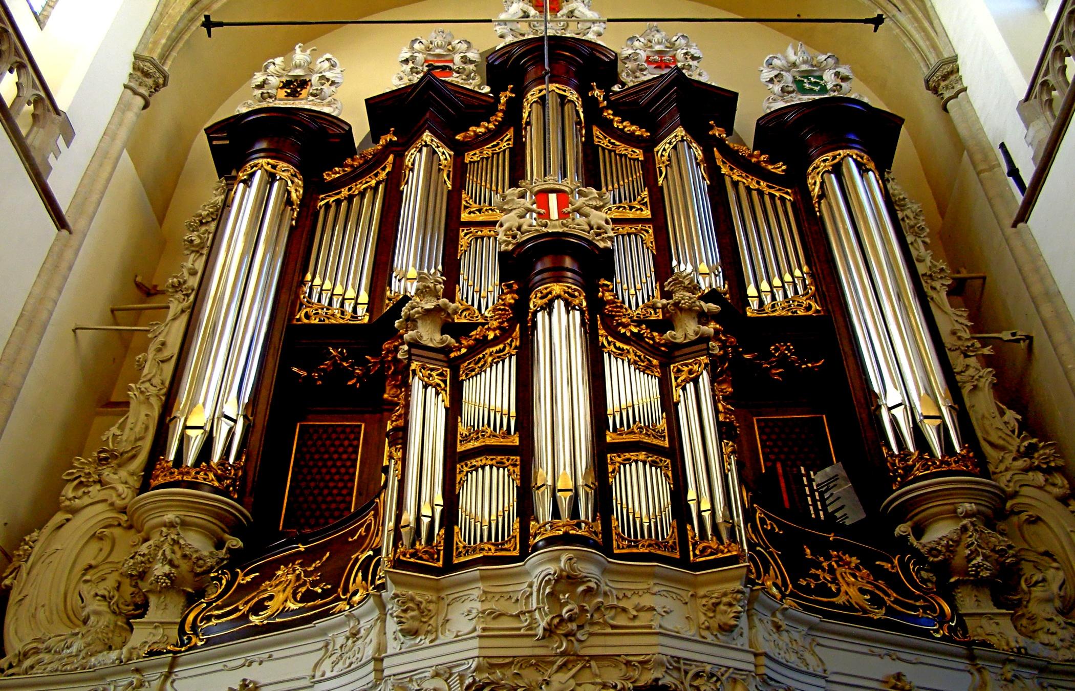 Description: A large pipe organ in a church with a clock on it's side wall and a cross above it.
