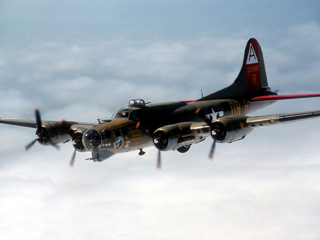 Description: A large propeller plane flying through a cloudy sky with propellers on it's wings and a propeller on the front of the plane.