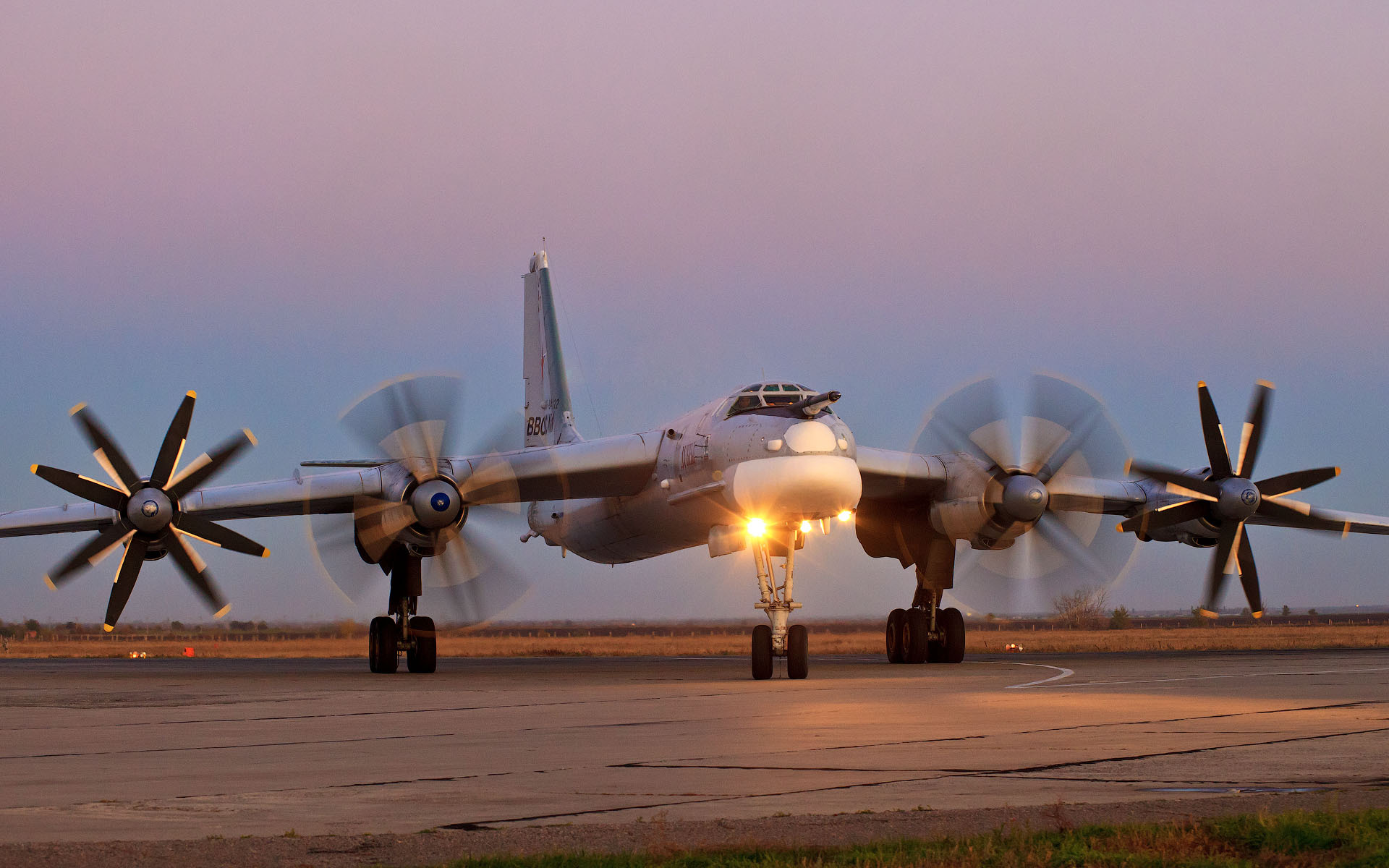 Description: A large propeller plane sitting on top of an airport runway at sunset with the sun shining through the wings.