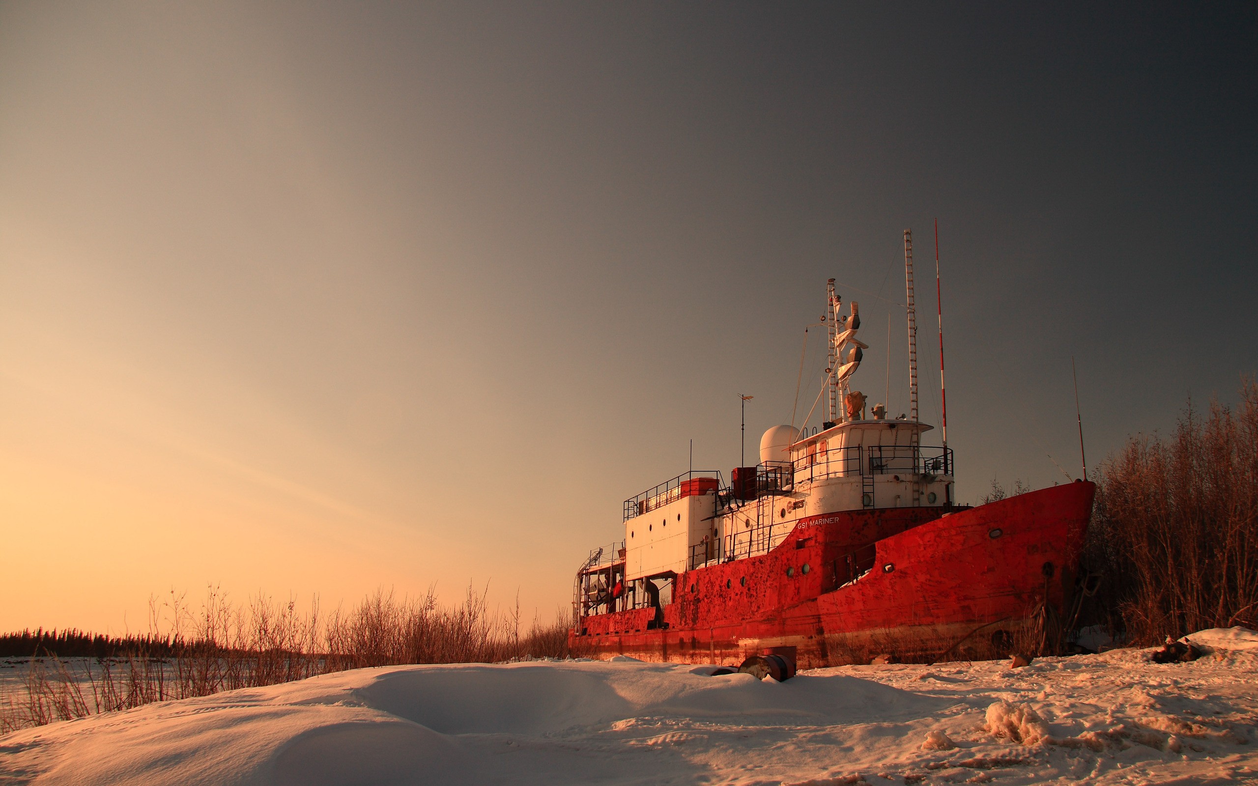 Description: A large red boat sitting on top of a snow covered field next to a forest and a body of water.