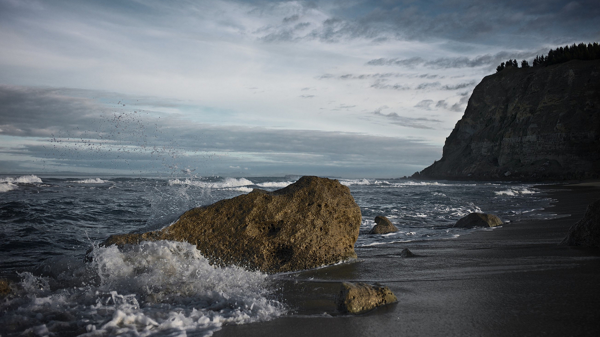 Description: A large rock sitting on top of a sandy beach next to the ocean with birds flying overhead in the sky.