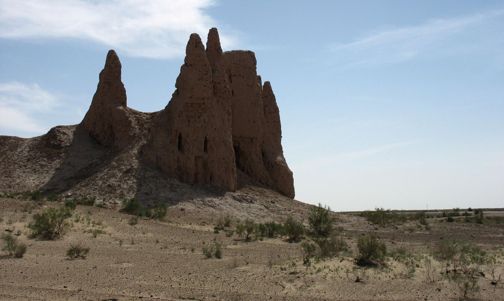 Description: A large rock formation in the middle of a desert area with a sky background and a few clouds in the sky.