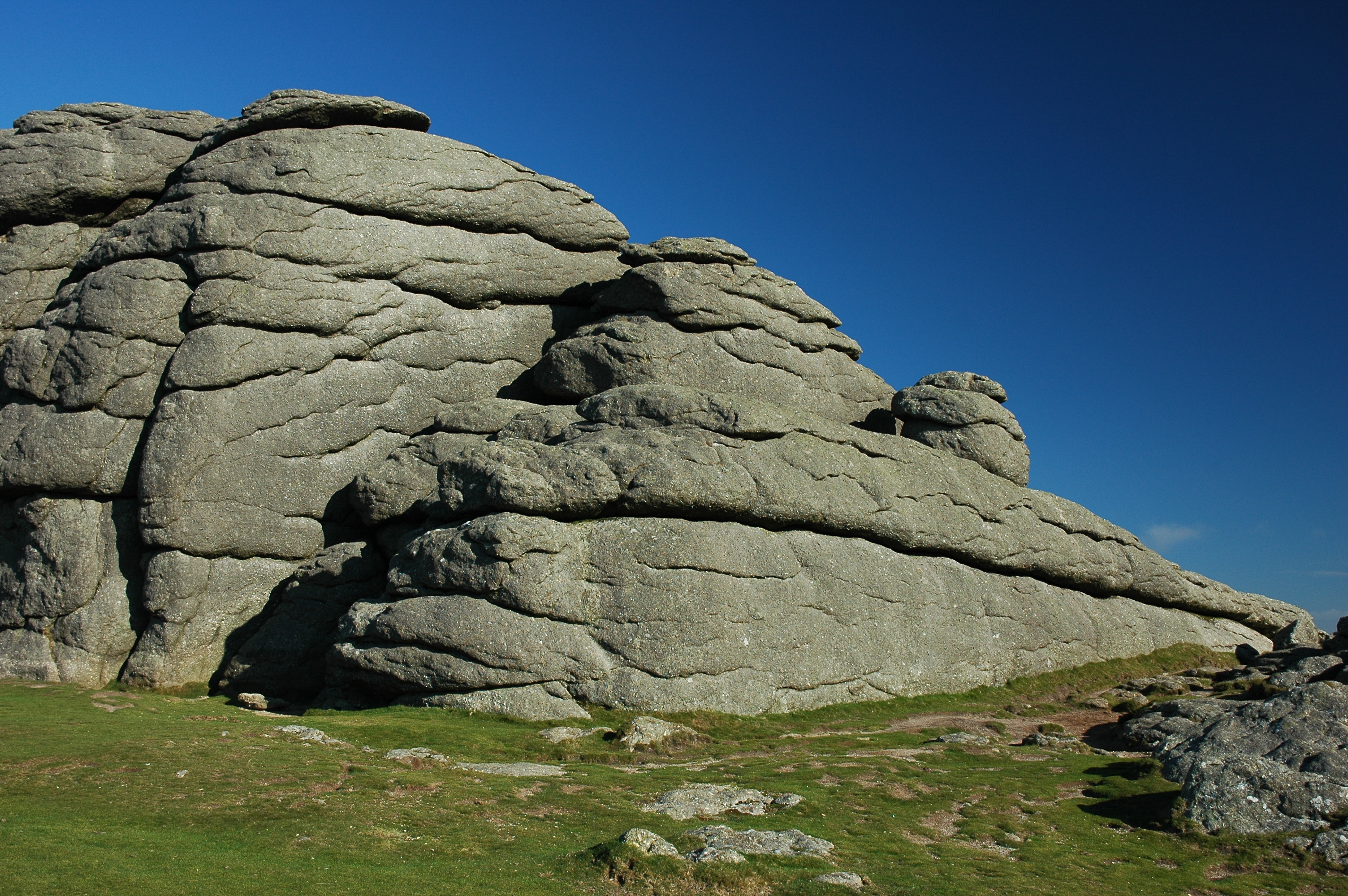 Description: A large rock formation with grass and rocks below it on a sunny day with a blue sky in the background.