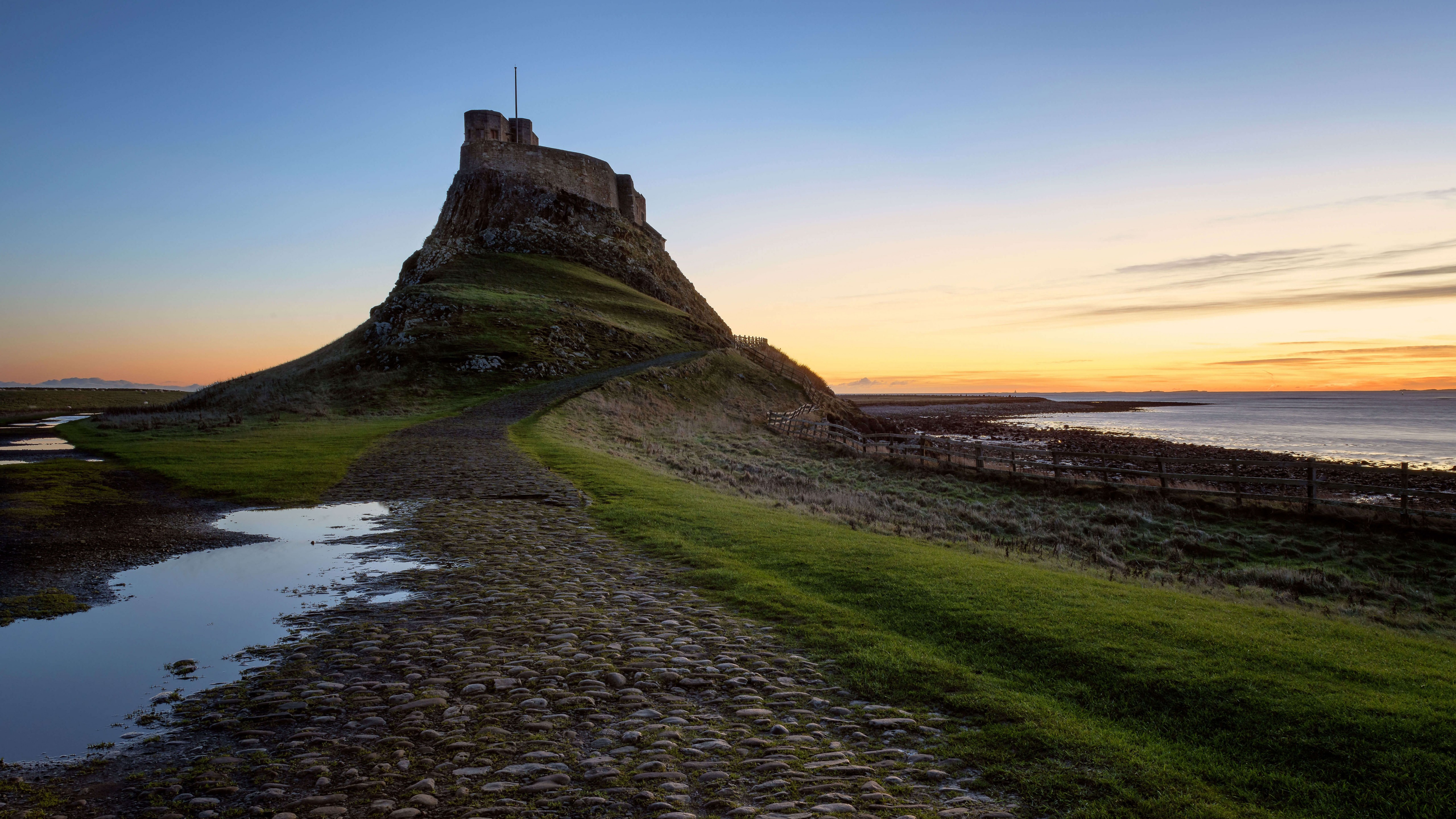 Description: A large rock formation next to a body of water at sunset with a sky background and a path leading to it.
