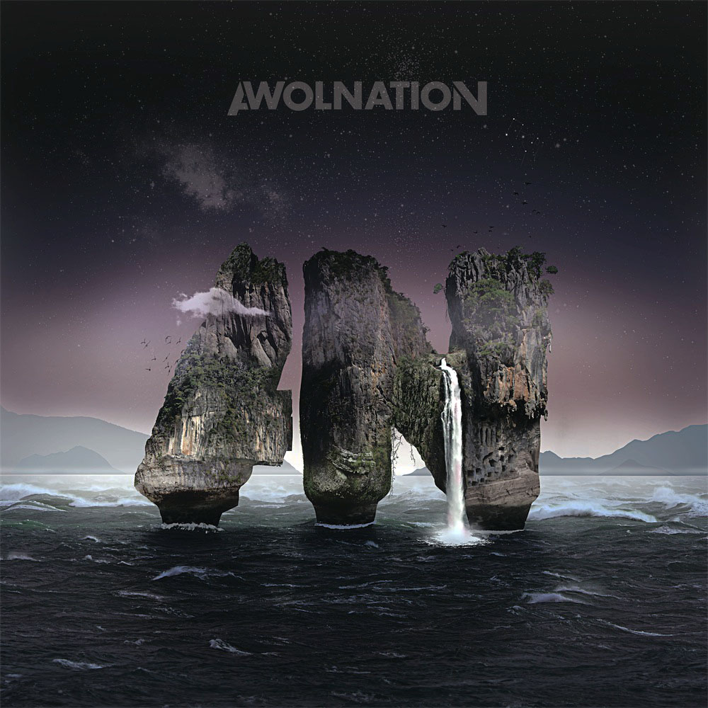 Description: A large rock formation in the middle of the ocean with a waterfall coming out of it and a sky with stars above.