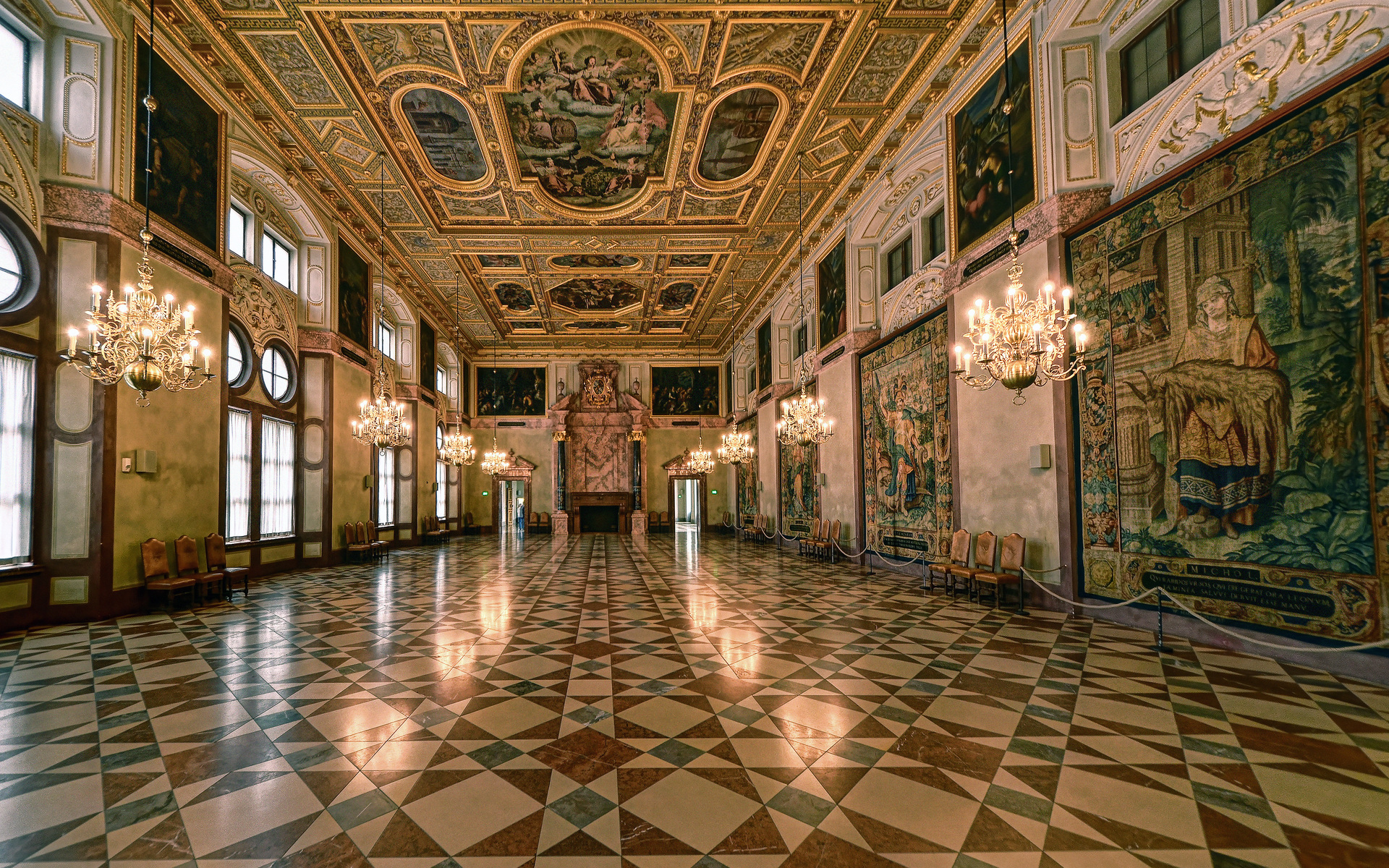 Description: A large room with a checkered floor and a chandelier hanging from the ceiling and a large tapestry on the wall.