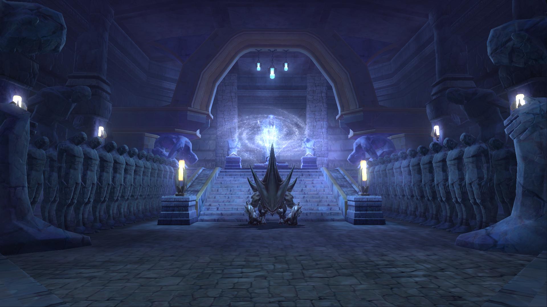 Description: A large room with a giant statue and a giant clock on the wall and a light at the end.