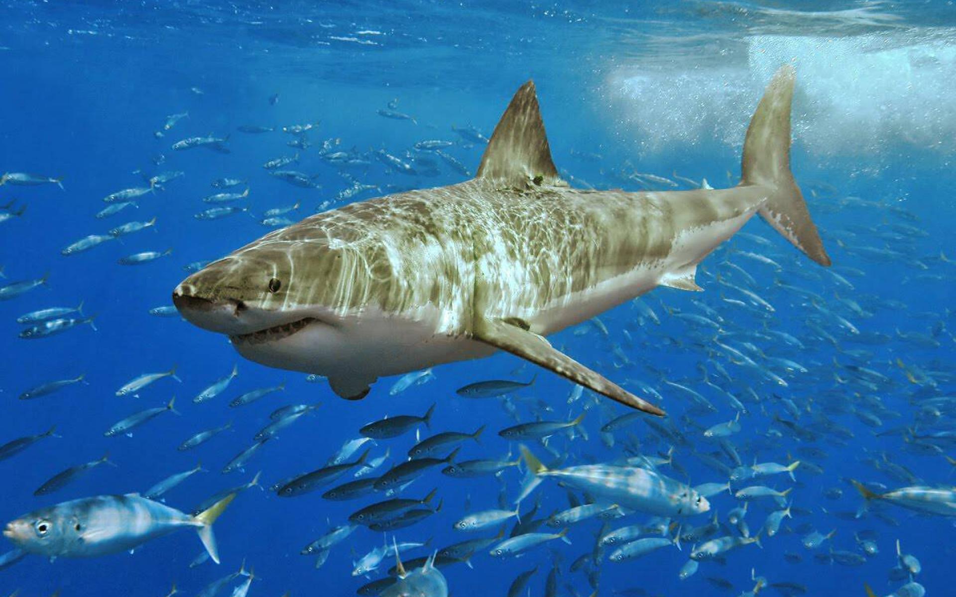 Description: A large shark swimming in the ocean surrounded by fish and a diver in the water's surface.