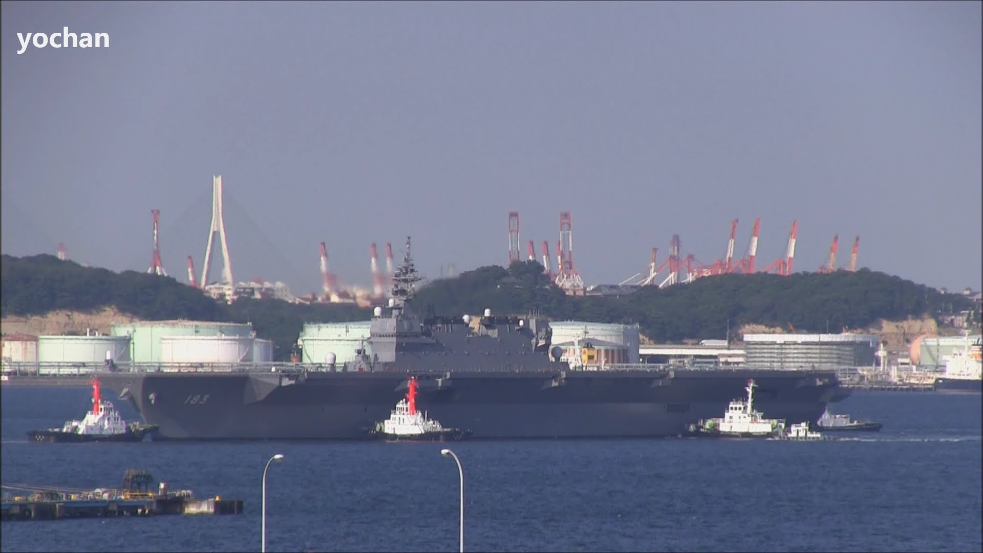 Description: A large ship in the water near a dock with a tug boat in the water and a large ship in the background.