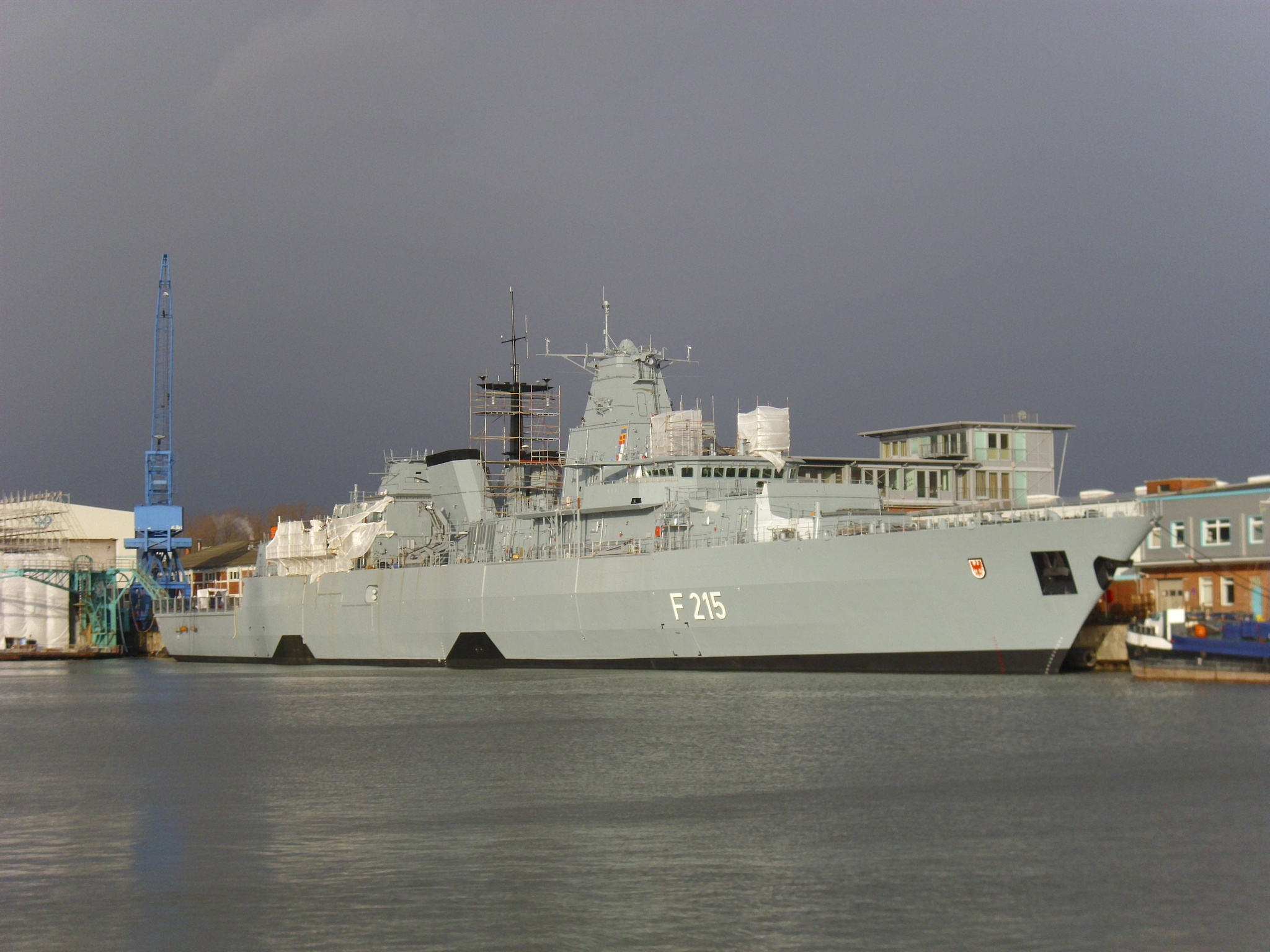 Description: A large ship docked in a harbor with buildings in the background and a cloudy sky above it.