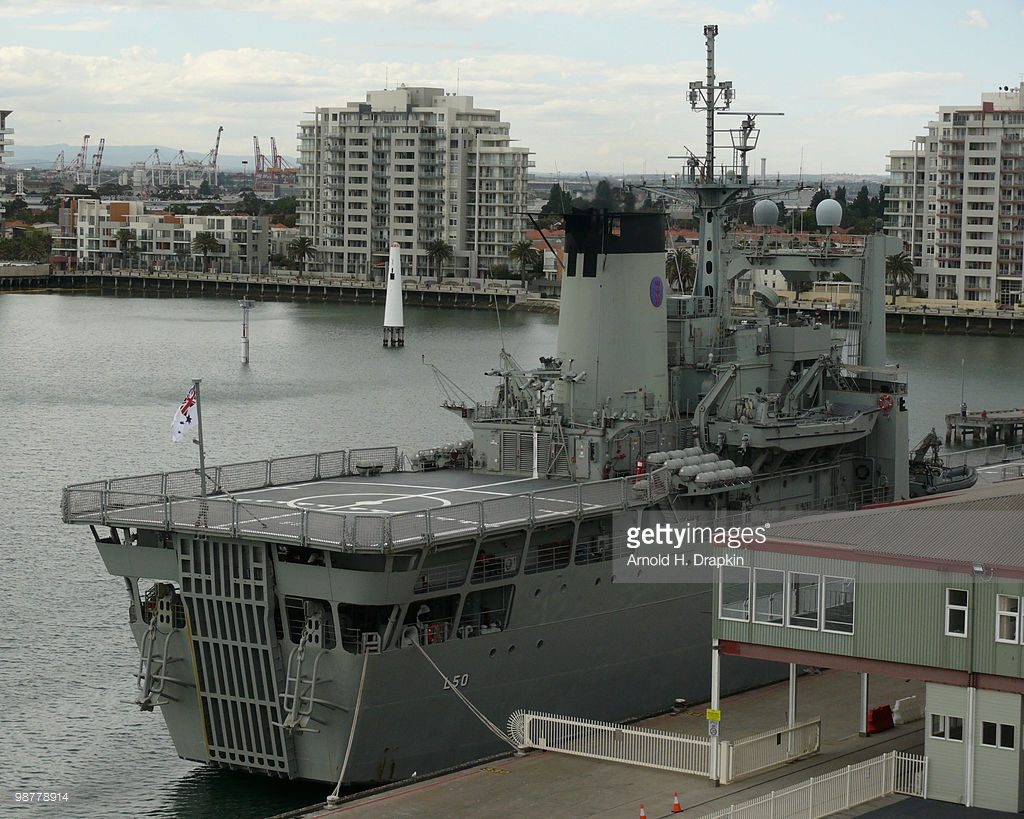 Description: A large ship docked in a harbor next to a city with tall buildings and a flagpole on it.