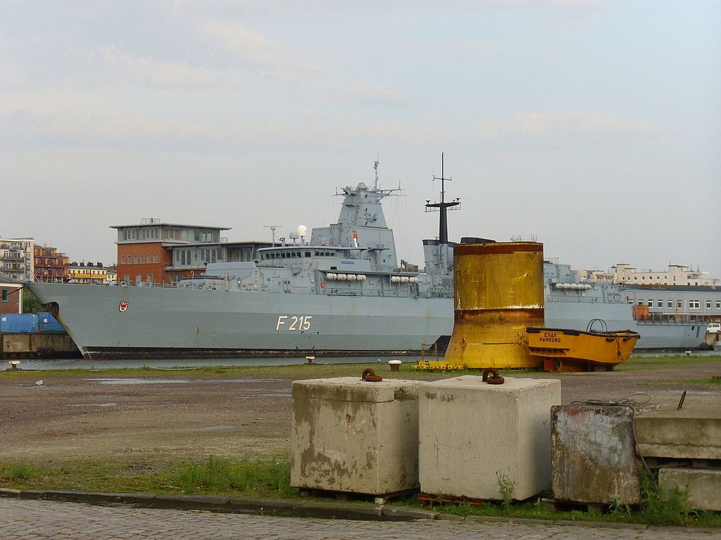 Description: A large ship is docked in a harbor with concrete blocks in front of it and a few buildings in the background.
